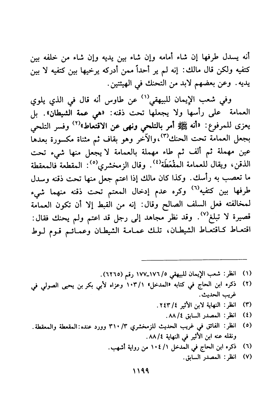 وفي شعب الإيمان للبيهقي عن طاوس أنه قال في الذي يلوي العمامة على رأسها ولا يجعلها تحت ذقنه: "هي عمة الشيطان". بل يعزى للمرفوع: "أنه صلى الله عليه وسلم أمر بالتلحي ونهى عن الاقتعاط" وفسر التلحي بجعل العمامة تحت الحنك، والآخر وهو بقاف ثم ثمناة مكسورة بعدها عين مهملة ثم ألف ثم طاء مهملة بالعمامة لا يجعل منها شيء تحت الذقن، ويقال للعمامة المقطعة. وقال الزمخشري: المقطعة فالمقطعة ما تعصب به رأسك. وكذا كان مالك إذا اعتم جعل منها تحت ذقنه وسدل طرفها بين كتفيه وكره عدم إدخار المعتم تحت ذقنه منهما شيء لمخالفته فعل السلف الصالح وقال: إنه م القبط إلا أن تكون العمامة قصيرة لا تبلغ. وقد نظر مجاهد إلى رجل قد اعتم ولم يحنك فقال: اقتعاط كاقتعاط الشيطان، تلك عمامة الشيطان وعمائم قوم لوط
