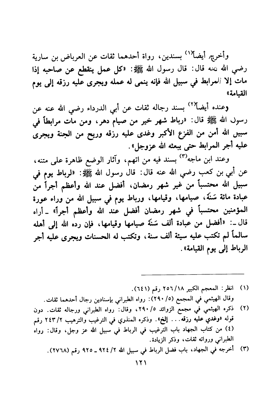وأخرج أيضًا بسندين، رواة أحدهما ثقات عن العرباض بن سارية رضي الله عنه قال: قال رسول الله صلى الله عليه وسلم: «كل عمل ينقطع عن صاحبه إذا مات إلا المرابط في سبيل الله فإنه ينمى له عمله ويجرى عليه رزقه إلى يوم القيامة».