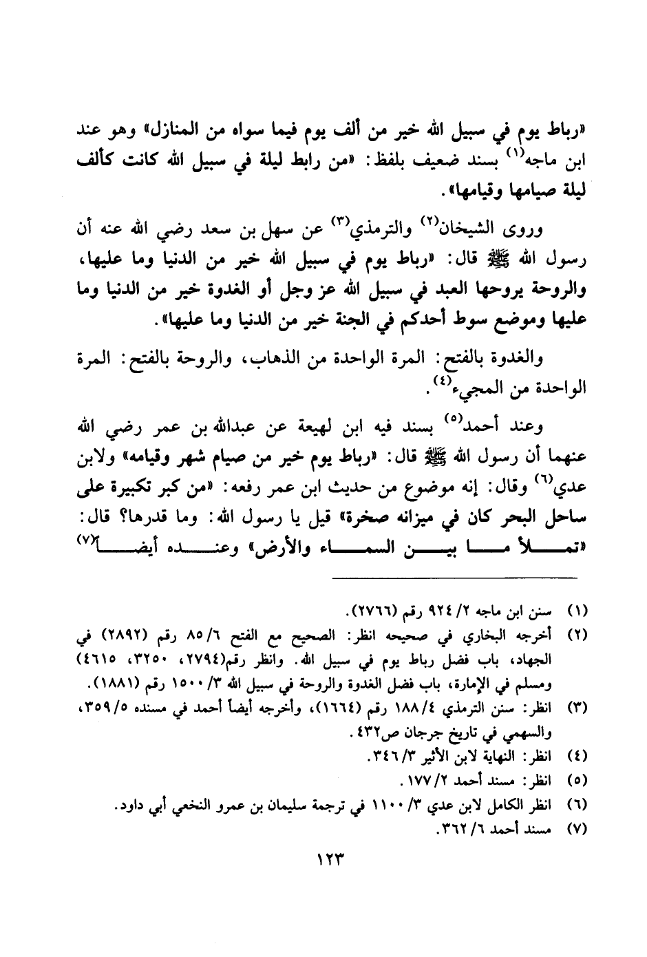 وروى الشيخان والترمذي عن سهل بن سعد رضي الله عنه أن رسول الله صلى الله عليه وسلم قال: "رباط يوم في سبيل الله خير من الدنيا وما عليها، والروحة يروحها العبد في سبيل الله عز وجل أو الغدوة خير من الدنيا وما عليها وموضع سوط أحدكم في الجنة خير من الدنيا وما عليها".