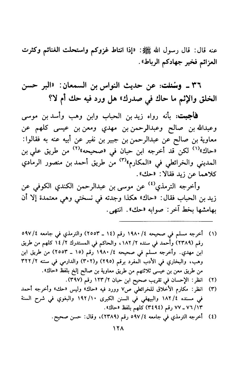 36 - وسُئلت: عن حديث النواس بن السمعان: "البر حسن الخلق والإثم ما حاك في صدرك" هل ورد فيه حك أم لا؟