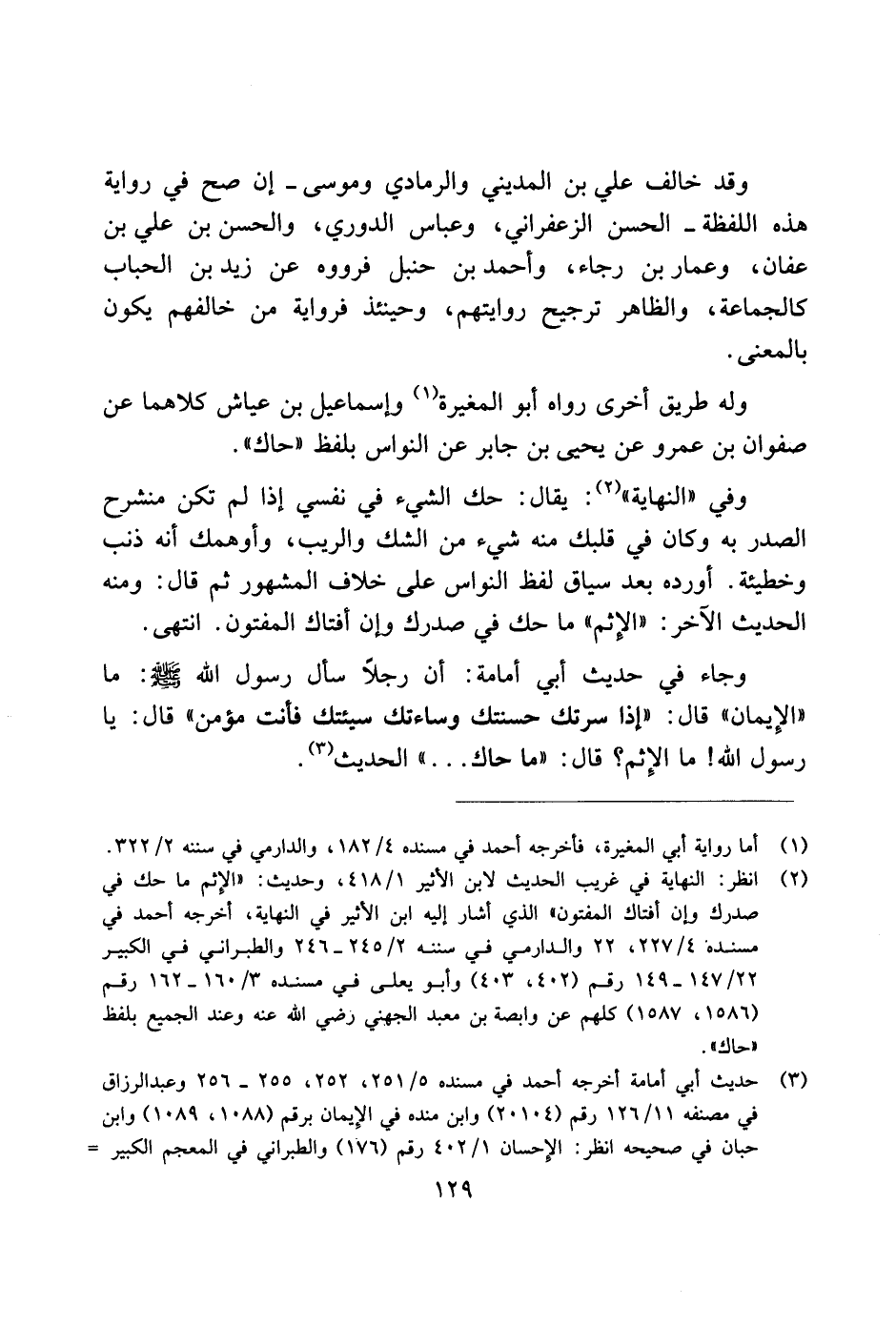 وجاء في حديث أبي أمامة: أن رجلاً سال رسول الله صلى الله عليه وسلم: ما "الإيمان" قال: "إذا سرتك حسنتك وساءتك سيئتك فأنت مؤمن" قال: يا رسول الله! ما الإثم؟ قال: "ما حاك ... " الحديث.