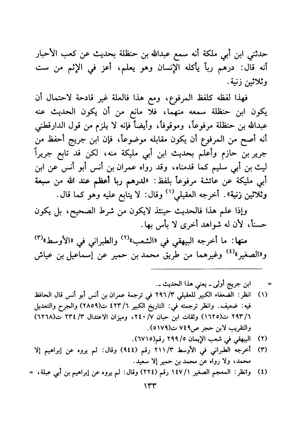 فهذا لفظه كلفظ المرفوع، ومع هذا فالعلة غير قادحة لاحتمال أن يكون ابن حنظلة سمعه منهما، فلا مانع من أن يكون الحديث عنه عبد الله بن حنظلة مرفوعًا، وموقوفًا، وأيضًا فإنه لا يلزم من قوله الدارقطني أنه أصح من المرفوع أن يكون مقابله موضوعًا، فإن ابن جريج أحفظ من جرير بن حازم وأعلم بحديث ابن أبي مليكة منه، لكن قد تابع جريرًا ليث بن أبي سليم كما قدمناه، وقد رواه عمران بن أنس أبو أنس عن ابن أبي مليكة عن عائشة مرفوعًا بلفظ: "لدرهم ربا أعظم عند الله من سبعة وثلاثين زنية". أخرجه العقيلي وقال: لا يتابع عليه وهو كما قال.