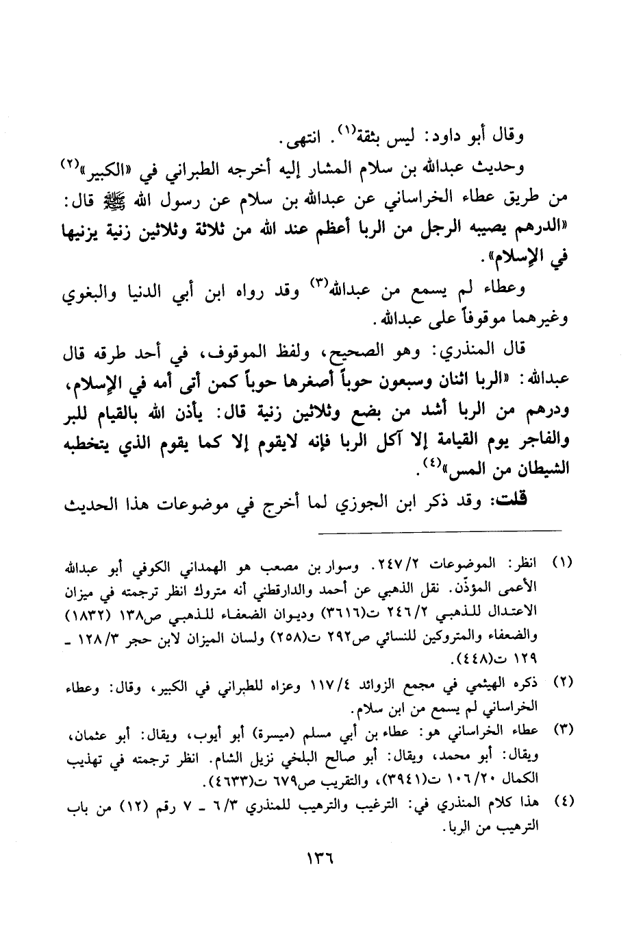 وحديث عبد الله بن سلام المشار إليه أخرجه الطبراني في "الكبير" من طريق عطاء الخراساني عن عبد الله بن سلام عن رسول الله صلى الله عليه وسلم قال: "الدرهم يصيبه الرجل من الربا أعظم عند الله من ثلاثة وثلاثين زنية يزنيها في الإسلام".