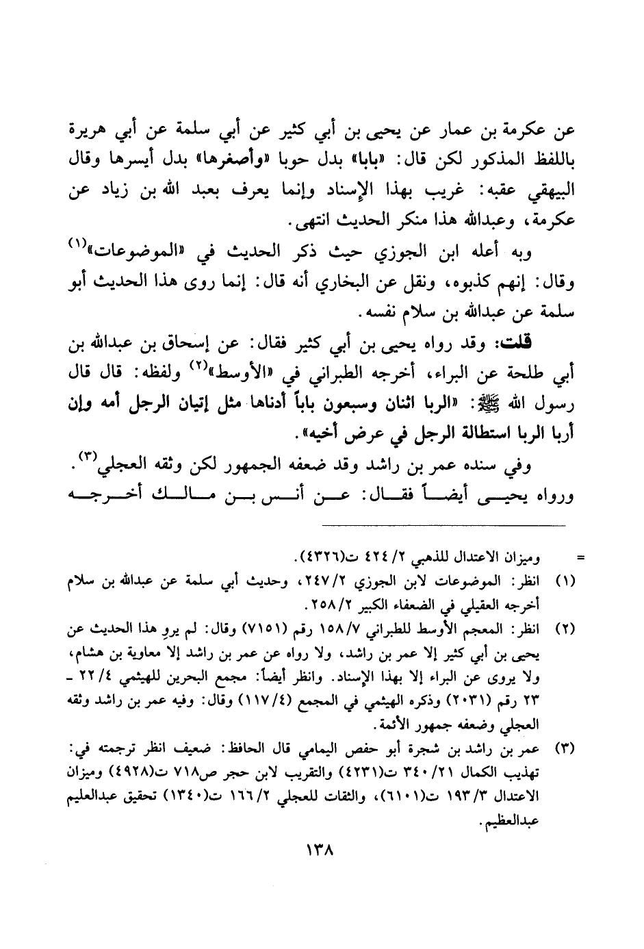 قلت: وقد رواه يحيى بن أبي كثير فقال: عن إسحاق بن عبد الله بن أبي طلحة عن البراء، أخرجه الطبراني في "الأوسط" ولفظه: قال قال رسول الله صلى الله عليه وسلم: "الربا اثنان وسبعون بابًا أدناها مثل إتيان الرجل أمه وإن أربا الربا استطالة الرجل في عرض أخيه".
