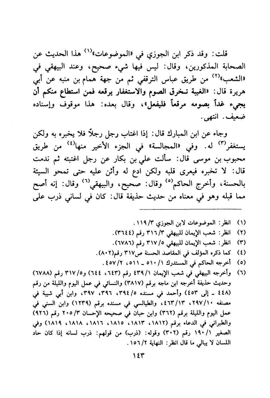 قلت: وقد ذكر ابن الجوزي في "الموضوعات" هذا الحديث عن الصحابة المذكورين، وقال: ليس فيها شيء صحيح، وعند البيهقي في "الشعب" من طريق عباس الترقفي ثم من وجهة همام بن منبه عن أبي هريرة قال: "الغيبة تخرق الصوم والاستغفار يرقعه فمن استطاع منكم أن يجيء غدًا بصومه مرقعًا فليفعل"، وقال بعده: هذا موقوف وإسناده ضعيف. انتهى.