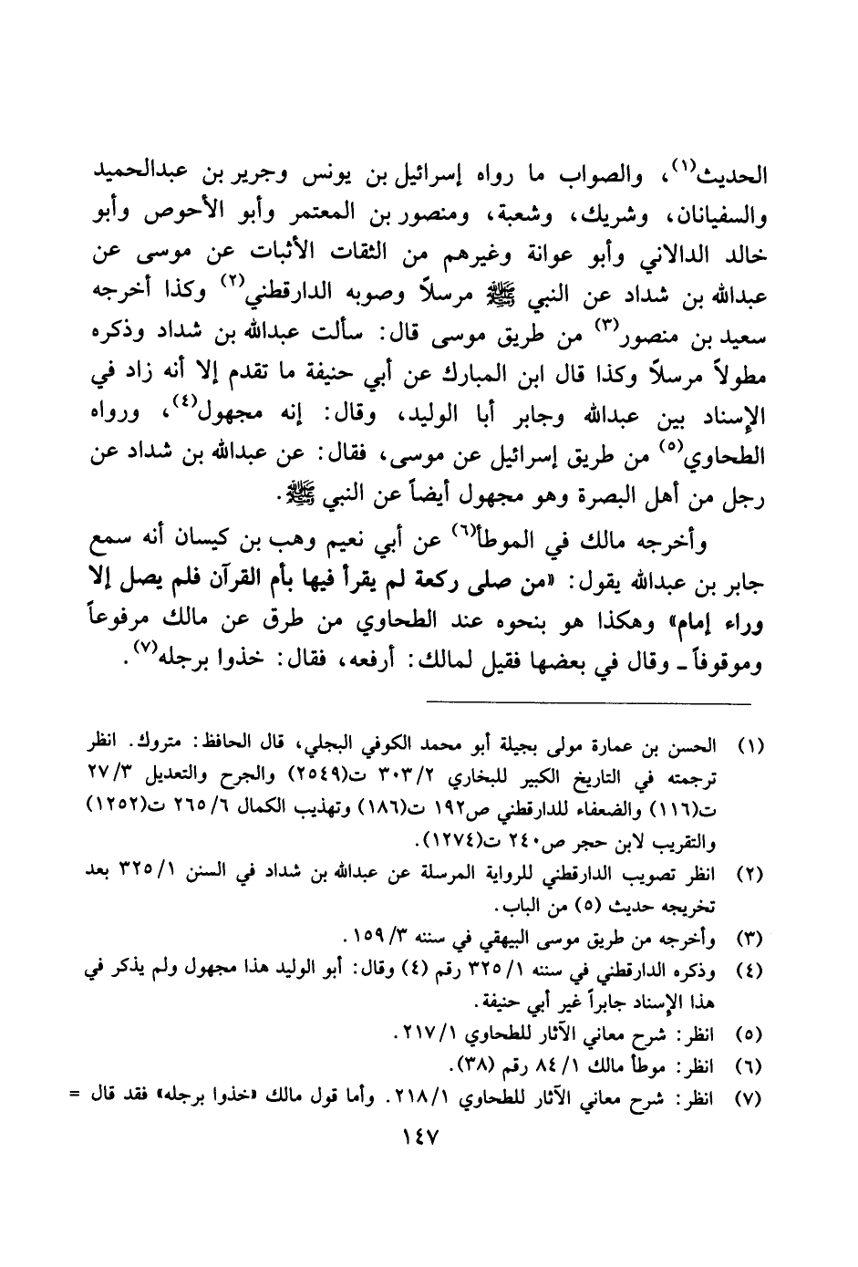 الحديث، والصواب ما رواه إسرائيل بن يونس وجرير بن عبد الحميد والسفيانان، وشريك، وشعبة، ومنصور بن المعتمر وأبو الأحوص وابو خالد الدالاني وأبو عوانة وغيرهم من الثقات الأثبات عن موسى عن عبد الله بن شداد عن النبي صلى الله عليه وسلم مرسلاً وصوبه الدارقطني وكذا أخرجه سعيد بن منصور من طريق موسى قال: سألت عبد الله بن شداد وذكره مطولاً مرسلاً وكذا قال ابن المبارك عن أبي حنيفة ما تقدم إلا أنه زاد في الإسناد بين عبد الله وجابر أبا الوليد، وقال: إنه مجهول، ورواه الطحاوي من طريق إسرائيل عن موسى، فقال: عن عبد الله بن شداد عن رجل من أهل البصرة وهو مجهول أيضًا عن النبي صلى الله عليه وسلم.