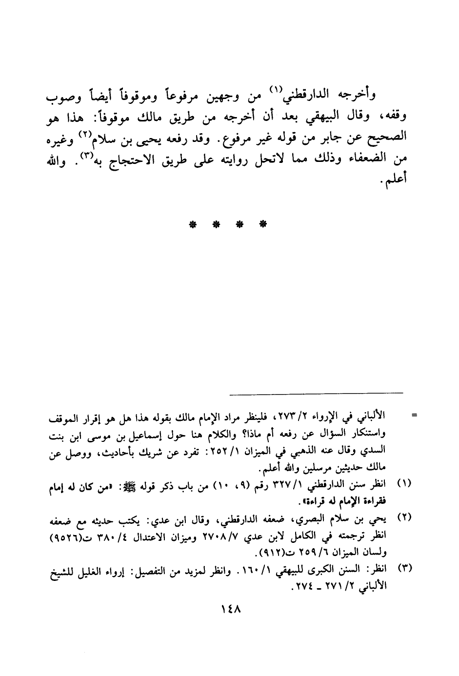 وأخرجه الدارقطني من وجهين مرفوعًا وموقوفًا أيضًا وصوب وقفه، وقال البيهقي بعد أن أخرجه من طريق مالك موقوفًا: هذا هو الصحيح عن جابر من قوله غير مرفوع. وقد رفعه يحيى بن سلام وغيره من الضعفاء وذلك مما لا تحل روايته على طريق الاحتجاج به. والله أعلم.