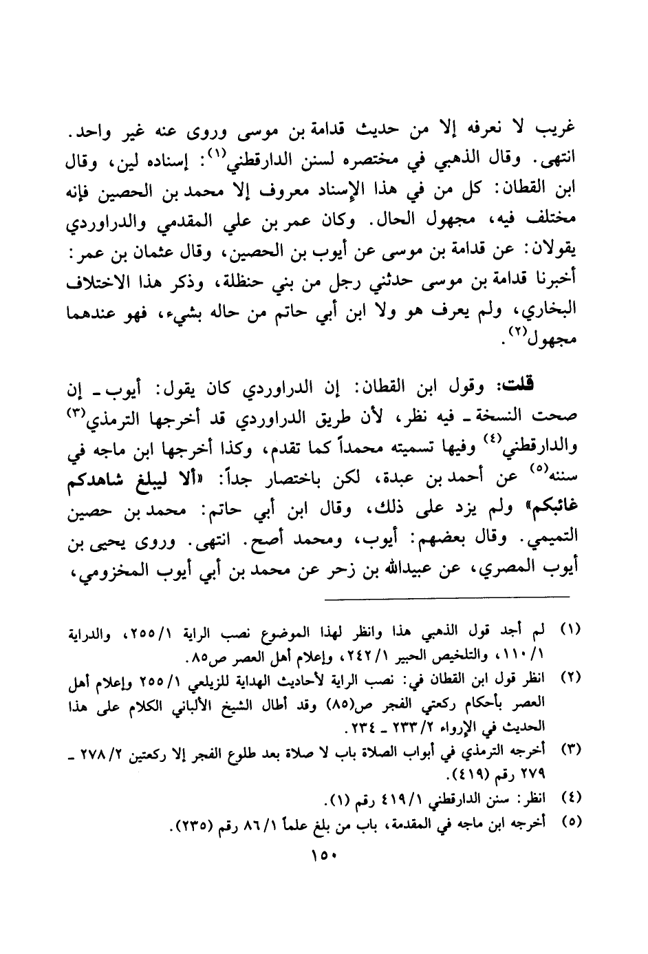 انتهى. وقال الذهبي في مختصره لسنن الدارقطني: إسناده لين، وقال ابن القطان: كل من في هذا الإسناد معروف إلا محمد بن الحصين إنه مختلف فيه، مجهول الحال. وكان عمر بن علي المقدمي والدراوردي يقولان: عن قدامة بن موسى حدثني رجل من بني حنظلة، وذكر هذا الاختلاف البخاري، ولم يعرف هو ولا ابن أبي حاتم من حاله بشيء، فهو عندهما مجهول.