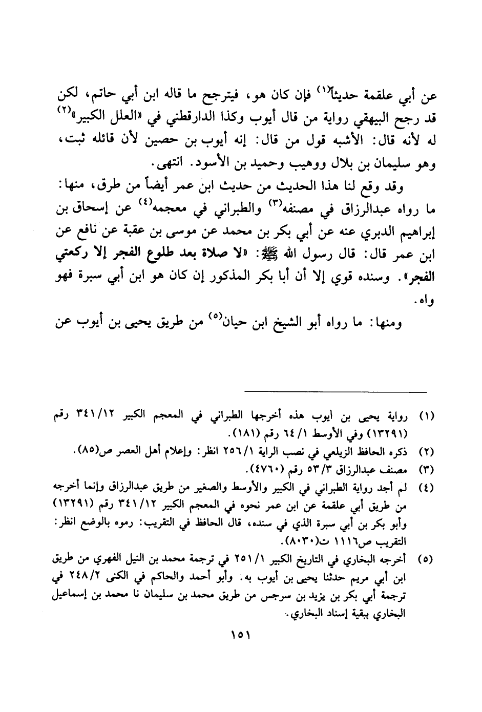وقد وقع لنا هذا الحديث من حديث ابن عمر أيضًا من طرق، منها: ما رواه عبد الرازق في مصنفه والطبراني في معجمه عن إسحاق بن إبراهيم الدبري عنه عن أبي بكر بن محمد عن موسى بن عقبة عن نافع عن ابن عمر قال: قال رسول الله صلى الله عليه وسلم: "لا صلاة بعد طلوع الفجر إلا ركعتي الفجر". وسنده قوي إلا أن أبا بكر المذكور إن كان هو ابن أبي سبرة فهو واه.