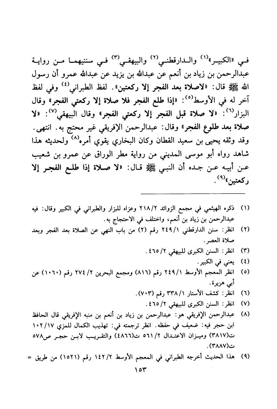 في "الكبير" والدارقطني والبيهقي في سنتيهما من رواية عبد الرحمن بن زياد بن أنعم عن عبد الله بن يزيد عن عبد الله عمرو أن رسول الله صلى الله عليه وسلم قال: "لا صلاة بعد الفجر إلا ركعتين". لفظ الطبراني وفي لفظ آخر له في الأوسط: "إذا طلع الفجر فلا صلاة إلى ركعتي الفجر" وقال البزار: "لا صلاة قبل الفجر إلى ركعتي الفجر" وقال البيهقي: "لا صلاة بعد طلوع الفجر" وقال: عبد الرحمن الإفريقي غير محتج به. انتهى. وقد وثقه يحيى بن سعيد القطان وكان البخاري يقوي أمره ولحديثه هذا شاهد رواه أبو موسى المديني من رواية مطر الوراق عن عمرو بن شعيب عن أبيه عن جده أن النبي صلى الله عليه وسلم قال: "لا صلاة إذا طلع الفجر إلا ركعتين".