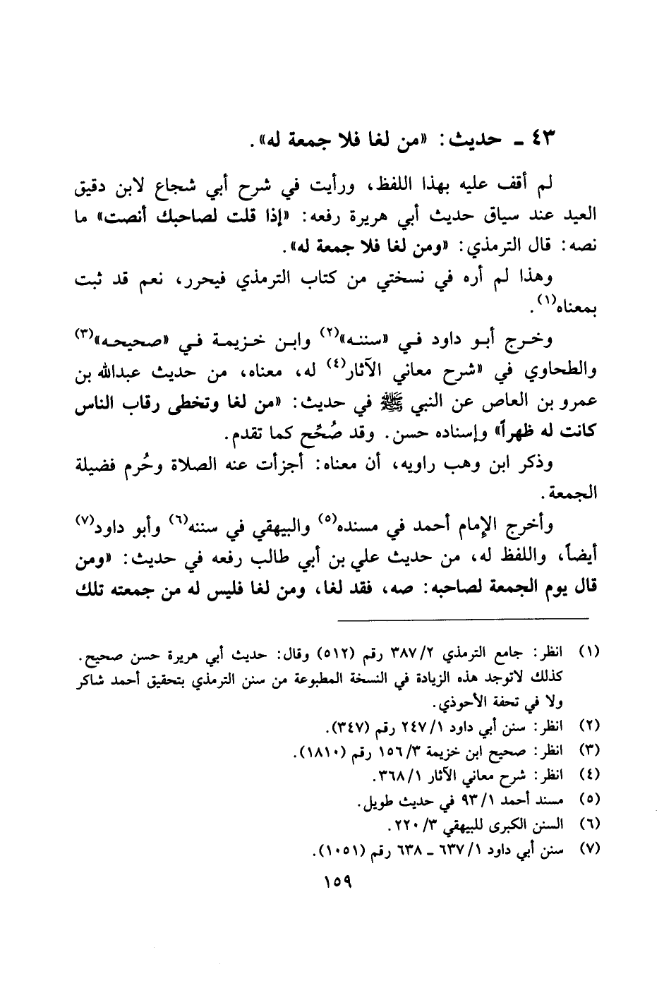 وأخرج الإمام أحمد في مسنده والبيهقي في سننه وأبو داود أيضًا، واللفظ له، من حديث علي بن أبي طالب رفعه في حديث: "ومن قال يوم الجمعة لصاحبه: صه، قد لغا، ومن لغا فليس له من جمعته تلك