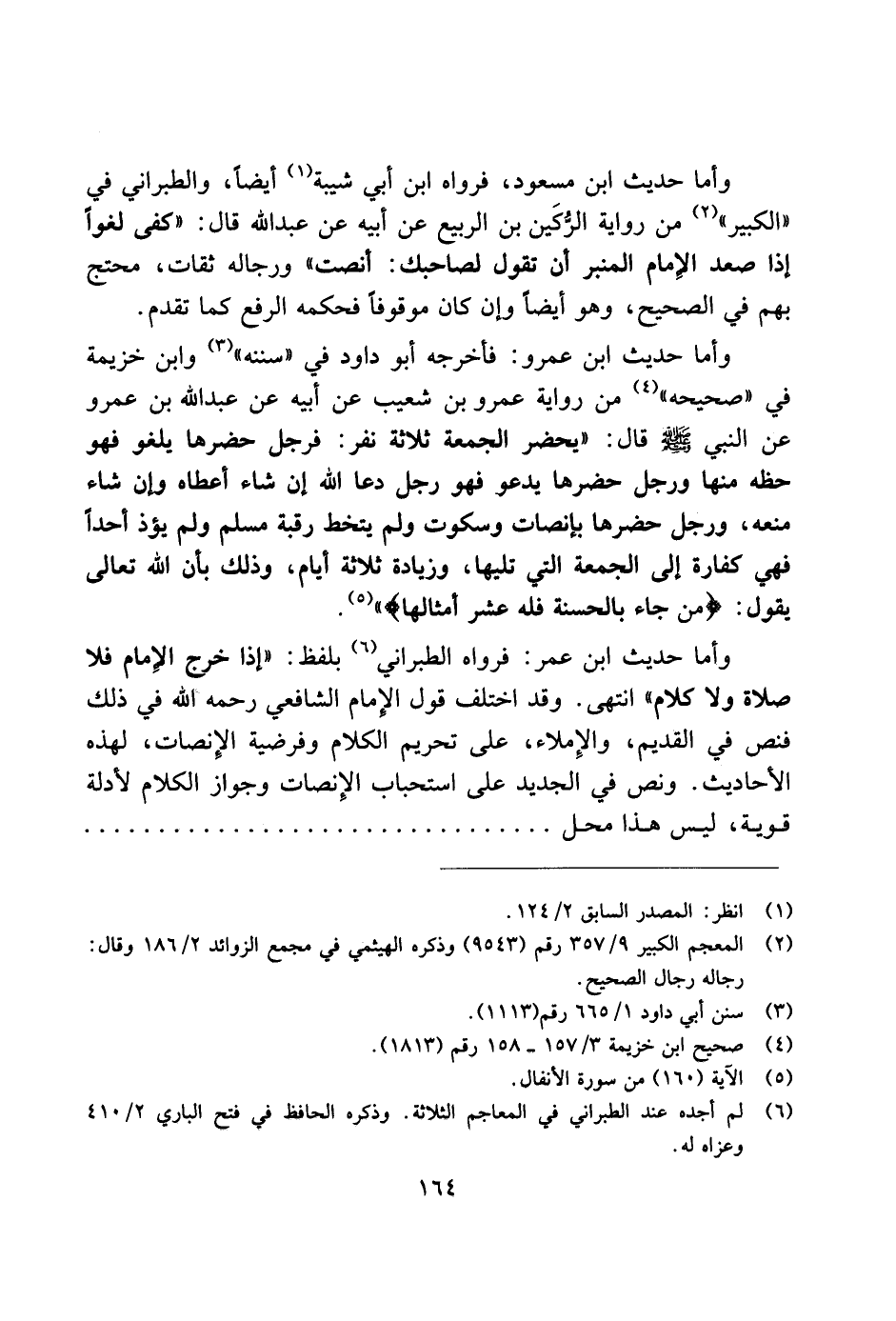 وأما حديث ابن عمر: فرواه الطبراني بلفظ: "إذا خرج الإمام فلا صلاة ولا كلام" انتهى. وقد اختلف قول الإمام الشافعي رحمه الله في ذلك فنص في القديم، والإملاء، على تحريم الكلام وفرضية الإنصات، لهذه الأحاديث. ونص في الجديد على استحباب الإنصات وجواز الكلام لأدلة قوية، ليس هذا محل ..................................................