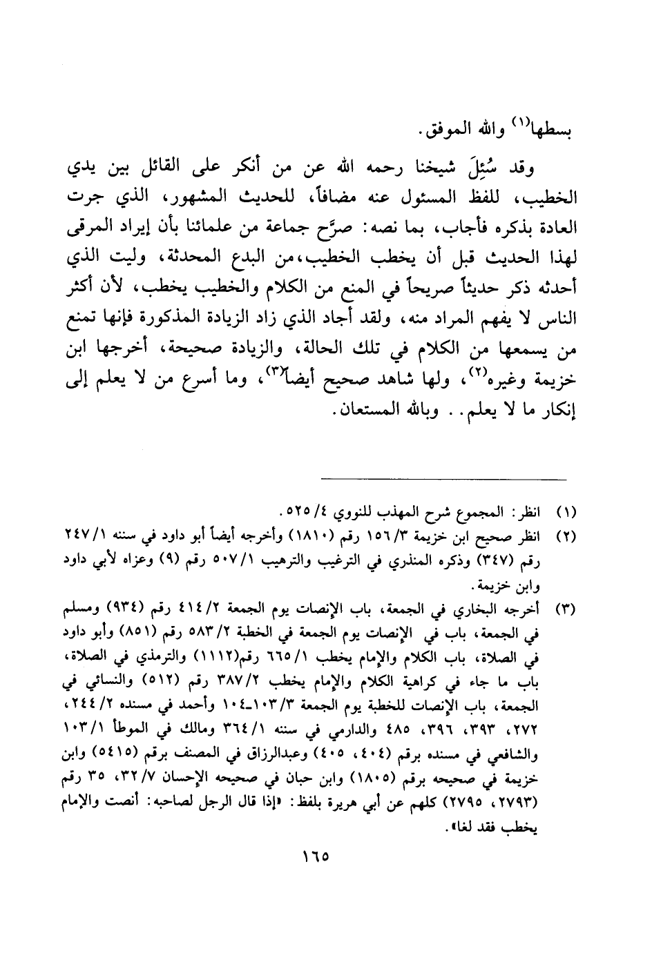 وقد سُئِلَ شيخنا رحمه الله عن من أنكر على القائل بين يدي الخطيب، للفظ المسئول عنه مضافًا، للحديث المشهور، الذي جرت العادة بذكره فاجاب، بما نصه: صرح جماعة من علمائنا بأن إيراد المرقى لهذا الحديث قبل أن يخطب الخطيب، من البدع المحدثة، وليت الذي أحدثه ذكر حديثًا صريحًا في المنع من الكلام والخطيب يخطب، لأن أكثر الناس لا يفهم المراد منه، ولقد أجاد الذي زاد الزيادة المذكورة فإنها تمنع من يسمعها من الكلام في تلك الحالة، والزيادة صحيحة، أخرجها ابن خزيمة وغيره، ولها شاهد صحيح أيضًا، وما أسرع من لا يعلم إلى إنكار ما لا يعلم .. وبالله المستعان.