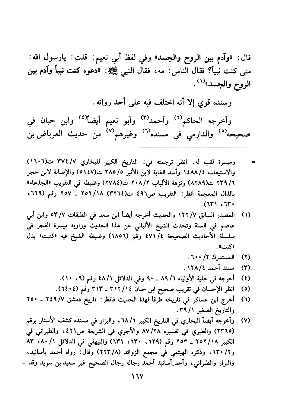 قال: "وآدم بين الروح والجسد" وفي لفظ أبي نعيم: قلت: يا رسول الله: متى كنت نبًا؟ فقال الناس: مه، فقال النبي صلى الله عليه وسلم: "دعوه كنت نبيًا وآدم بين الروح والجسد".