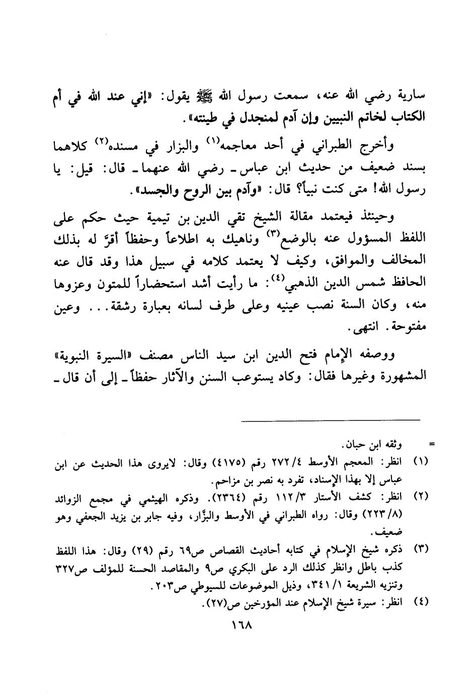 وأخرج الطبراني في أحد معاجمه والبزار في مسنده كلاهما بسند ضعيف من حديث ابن عباس ـ رضي الله عنهما ـ قال: قيل: يا رسول الله! متى كنت نبيًا؟ قال: "وآدم بين الروح والجسد".