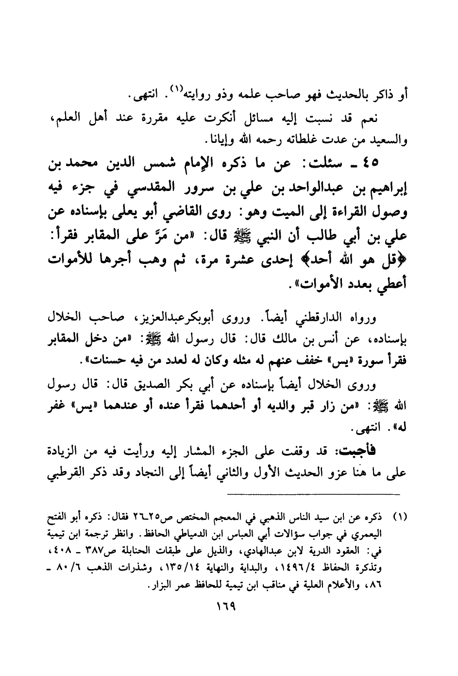 45 - سئلت: عن ما ذكره الإمام شمس الدين محمد بن إبراهيم بن عبد الواحد بن علي بن سرور المقدسي في جزء فيه وصول القراءة إلى الميت وهو: روى القاضي أبو يعلي بإسناده عن علي بن ابي طالب أن النبي صلى الله عليه وسلم قال: "من مر على المقابر فقرأ: (قل هو الله أحد) إحدى عشرة مرة، ثم وهب أجرها للأموات أعطى بعدد الأموات".