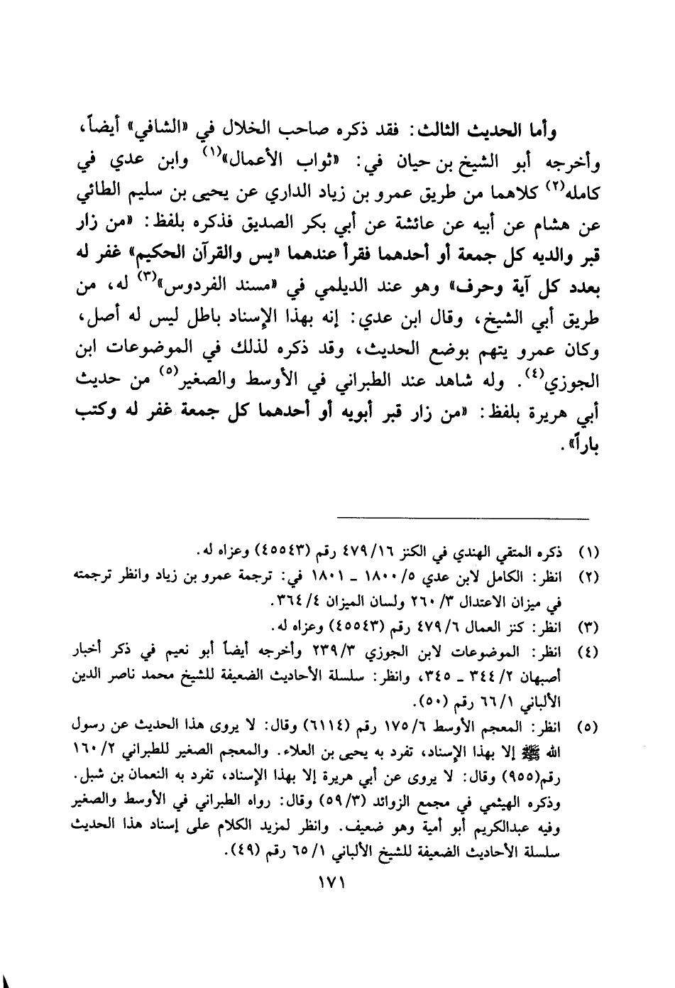 وأما الحديث الثالث: فقد ذكره صاحب الخلال في "الشافي" أيضًا، وأخرجه أبو الشيخ بن حيان في: "ثواب الأعمال" وابن عدي في كامله كلاهما من طريق عمرو بن زياد الداري عن يحيى بن سليم الطائي عن هشام عن أبيه عن عائشة عن أبي بكر الصديق فذكره بلفظ: "من زار قبر والديه كل جمعة أو أحدهما فقرأ عندهما "يس والقرآن الحكيم" غفر له بعدد كل آية وحرف" وهو عند الديلمي في "مسند الفردوس" له، من طريق أبي الشيخ، وقال ابن عدي: إنه بهذا الإسناد باطل ليس له أصل، وكان عمرو يتهم بوضع الحديث، وقد ذكر لذلك في الموضوعات ابن الجوزي. وله شاهد عند الطبراني في الأوسط والصغير من حديث أبي هريرة بلفظك "من زار قبر أبويه أو أحدهما كل جمعه غفر له وكتب بارًا".