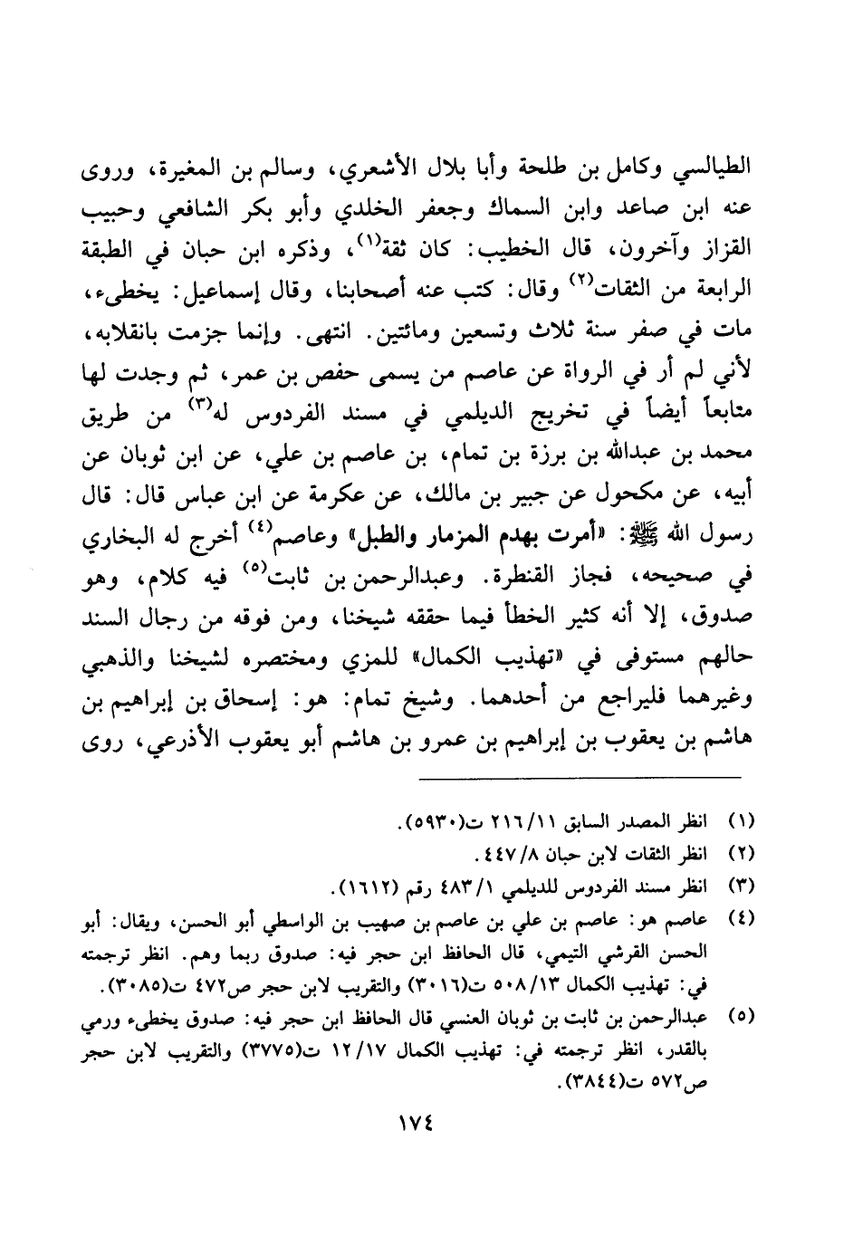 الطيالسي وكامل بن طلحة وأبا بلال الأشعري، وسالم بن المغيرة، وروى عنه ابن صاعد وابن السماك وجعفر الخلدي وأبو بكر الشافعي وحبيب القزاز وآخرون، قال الخطيب: كان ثقة، وذكره ابن حبان في الطبقة الرابعة من الثقات وقال: كتب عنه أصحابنا، وقال إسماعيل: يخطئ، مات في صفر سنة ثلاث وتسعين ومائتين. انتهى. وإنما جزمت بانقلابه، لأني لم أرد في الرواة عن عاصم من يسمى حفص بن عمر، ثم وجدت لها متابعًا أيضًا في تخريج الديلمي في مسند الفردوس له من طريق محمد بن عبد الله بن برزة بن تمام، بن عاصم بن علي، عن ابن ثوبان عن ابيه، عن مكحول عن جبير بن مالك، عن عكرمة عن ابن عباس قال: قال رسول الله صلى الله عليه وسلم: "أمرت بهدم المزمار والطبل" وعاصم أخرج له البخاري في صحيحه، فجاز القنطرة. وعبد الرحمن بن ثابت فيه كلام، وهو صدوق، إلا أنه كثير الخطأ فيما حققه شيخنا، ومن فوقه من رجال السند حالهم مستوفى في "تهذيب الكمال" للمزي ومختصره لشيخنا والذهبي وغيرهما فليراجع من أحدهما. وشيخ تمام: هو: إسحاق بن إبراهيم بن هاشم بن يعقوب بن إبراهيم بن عمرو بن هاشم أبو يعقوب الأذرعي، روى
