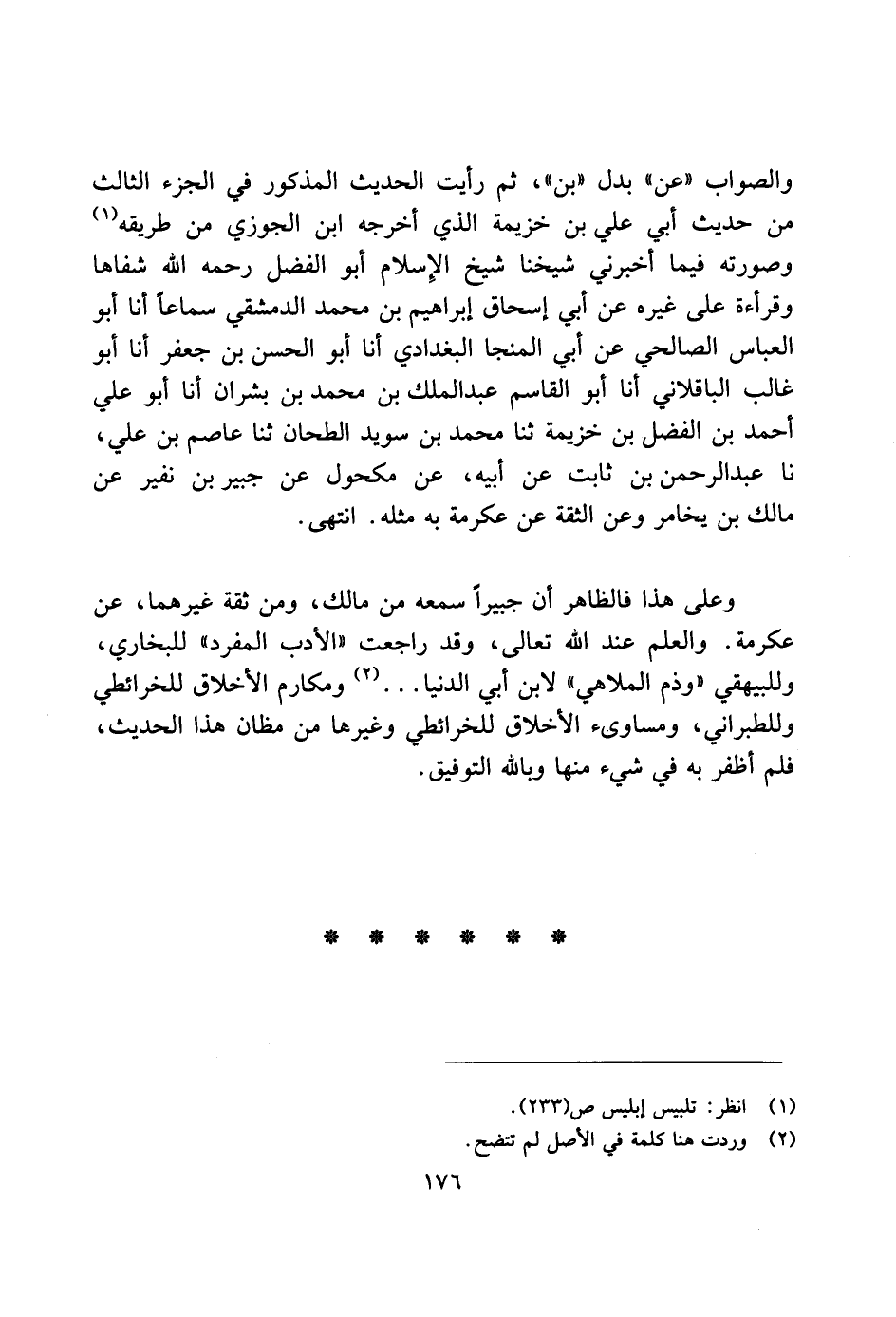 والصواب "عن" بدل "بن"، ثم رأيت الحديث المذكور في الجزء الثالث من حديث أبي علي بن خزيمة الذي أخرجه ابن الجوزي من طريقه وصورته فيما أخبرني شيخنا شيخ الإسلام أبو الفضل رحمه الله شفاها وقرأة على غيره عن أبي إسحاق إبراهيم بن محمد الدمشقي سماعًا أنا أبو العباس الصالحي عن أبي المنجا البغدادي أنا أبو الحسن بن جعفر أنا أبو غالب الباقلاني أنا أبو القاسم عبد الملك بن محمد بن بشران أنا أبو علي أحمد بن الفضل بن خزيمة ثنا محمد بن سويد الطحان ثنا عاصم بن علي، نا عبد الرحمن بن ثابت عن أبيه، عن مكحول عن جبير بن نفير عن مالك بن يخامر وعن الثقة عن عكرمة بن مثله. انتهى.