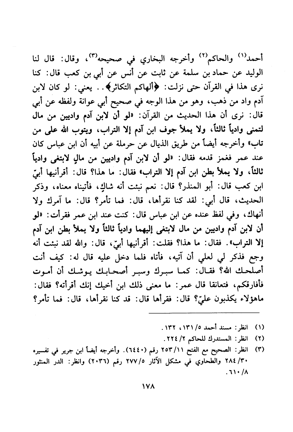 أحمد والحاكم وأخرجه البخاري في صحيحه، وقال: قال لنا الوليد عن حماد بن سلمة عن ثابت عن أنس عن أبي بن كعب قال: كنا نرى هذا في القرآن حتى نزلت: (ألهاكم التكاثر) .. يعني: لو كان لابن آدم واد من ذهب، وهو من هذا الوجه في صحيح أبي عوانة ولظفه عن أبي قال: نرى أن هذا الحديث من القرآن: "لو أن لابن آدم واديين من مال لتمنى واديًا ثالثًا، ولا يملأ جوف ابن آدم إلا التراب، ويتوب الله على من تاب" وأخرجه أيضًا من طريق الذيال عن حرملة عن أبيه أن ابن عباس كان عند عمر فغمز قدمه فقال: "لو أن لابن آدم واديين من مالٍ لابتغى واديًا ثالثًا، ولا يملأ بطن ابن آدم إلا التراب" فقال: ما هذا؟ قال: اقرأنيها أبي ابن كعب قال: أبو المنذر؟ قال: نعم نبئت أنه شاك، فأتيناه معناه، وذكر الحديث، قال أبي: لقد كنا نقرأها، قال: فما تأمر؟ قال: ما آمرك ولا أنهاك، وفي لفظ عنده عن ابن عباس قال: كنت عند ابن عمر فقرأت: "لو أن لابن آدم واديين من مال لابتغى إليهما واديًا ثالثًا ولا يملأ بطن ابن آدم إلا التراب". فقال: ما هذا؟ فقلت: أقرأنيها أبي، قال: والله لقد نبئت أنه وجع فذكر لي لعلي أن آتيه، فأتاه فلما دخل عليه قال له: كيف أنت أصلحك الله؟ فقال: كما سبرك وسبر أصحابك يوشك أن أموت فأفارقكم، فتعانقا قال عمر: ما معنى ذلك ابن أخيك إنك أقرأته؟ فقال: ما هؤلاء يكذبون علي؟ قال: فقرأها قال: قد كنا نقرأها، قال: فما تأمر؟