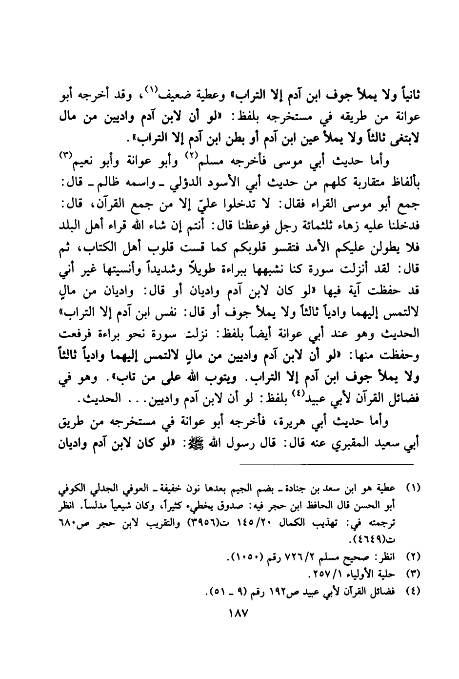 ثانيًا ولا يملأ جوف ابن آدم إلا التراب" وعطيه ضعيف، وقد أخرجه أبو عوانة من طريقه في مستخرجه بلفظ: "لو أن لابن آدم واديين من مال لابتغى ثالثًا ولا يملأ عين ابن آدم أو بطن ابن آدم إلا التراب".