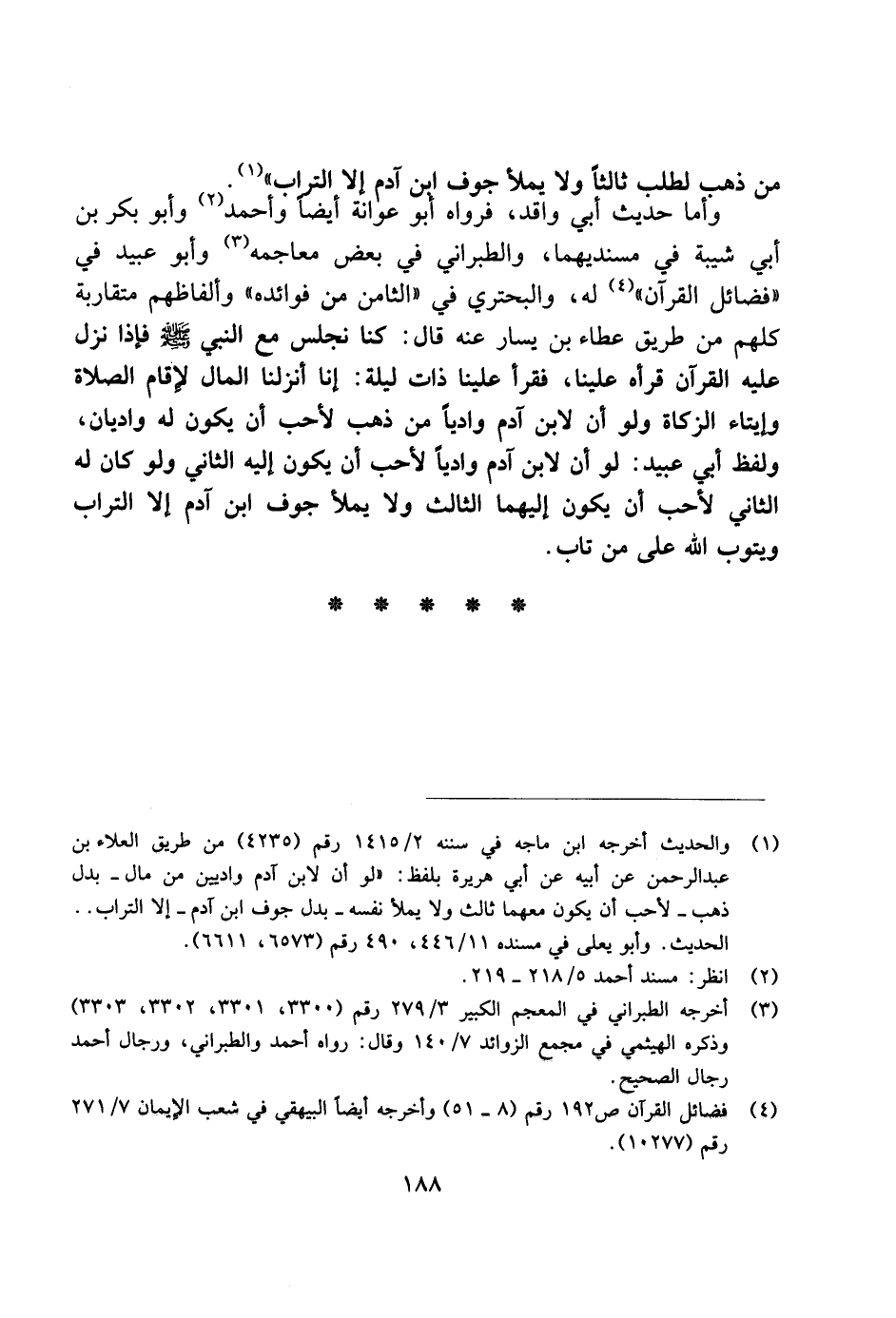 وأما حديث أبي واقد، فرواه أبو عوانة أيضًا وأحمد وأبو بكر بن أبي شيبة في مسنديهما، والطبراني في بعض معاجمه وأبو عبيد في «فضائل القرآن» له، والبحتري في «الثامن من فوائده» وألفاظهم متقاربة كلهم من طريق عطاء بن يسار عنه قال: كنا نجلس مع النبي صلى الله عليه وسلم فإذا نزل عليه القرآن قرأه علينا، فقرأ علينا ذات ليلة: إنا أنزلنا المال لإقام الصلاة وإيتاء الزكاة ولو أن لابن آدم واديًا من ذهب لأحب أن يكون له واديان، ولفظ أبي عبيد: لو أن لابن آدم واديًا لأحب أن يكون إليه الثاني ولو كان له الثاني لأحب أن يكون إليهما الثالث ولا يملأ جوف ابن آدم إلا التراب ويتوب الله على من تاب.