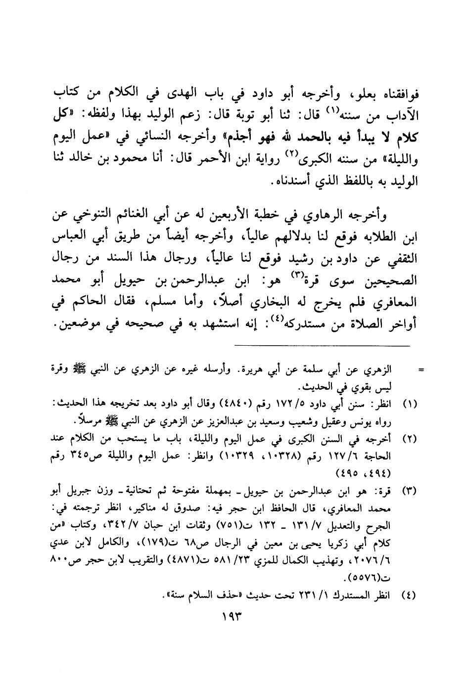 فوافقناه بعلو، وأخرجه أبو داود في باب الهدى في الكلام من كتاب الآداب من سننه قال: ثنا أبو توبة قال: زعم الوليد بهذا ولفظه: "كل كلام لا يبدأ فيه بالحمد لله فهو أجذم" وأخرجه النسائي في "عمل اليوم والليل" من سننه الكبرى رواية ابن الأحمر قال: أنا محمود بن خالد ثنا الوليد به باللفظ الذي أسندناه.