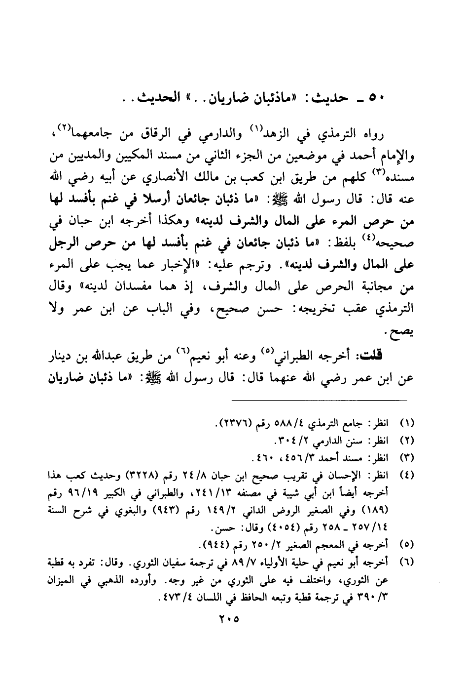 رواه الترمذي في الزهد والدارمي في الرقاق من جامعهما، والإمام أحمد في موضعين من الجزء الثاني من مسند المكيين والمديين من مسنده كلهم من طريق ابن كعب بن مالك الأنصاري عن أبيه رضي الله عنه قال: قال رسول الله صلى الله عليه وسلم "ما ذئبان جائعان أرسلا في غنم بأفسد لها من حرص المرء على المال والشرف لدينه" وهكذا أخرجه ابن حبان في صحيحه بلفظ: "ما ئبان جائعان في غنم بأفسد لها من حرص الرجل على المال والشرف لدينه". وترجم عليه: "الإخبار عما يجب على المرء من مجانبة الحرص على المال والشرف، إذ هما مفسدان لدينه" وقال الترمذي عقب تخريجه: حسن صحيح، وفي الباب عن ابن عمر ولا يصح.
