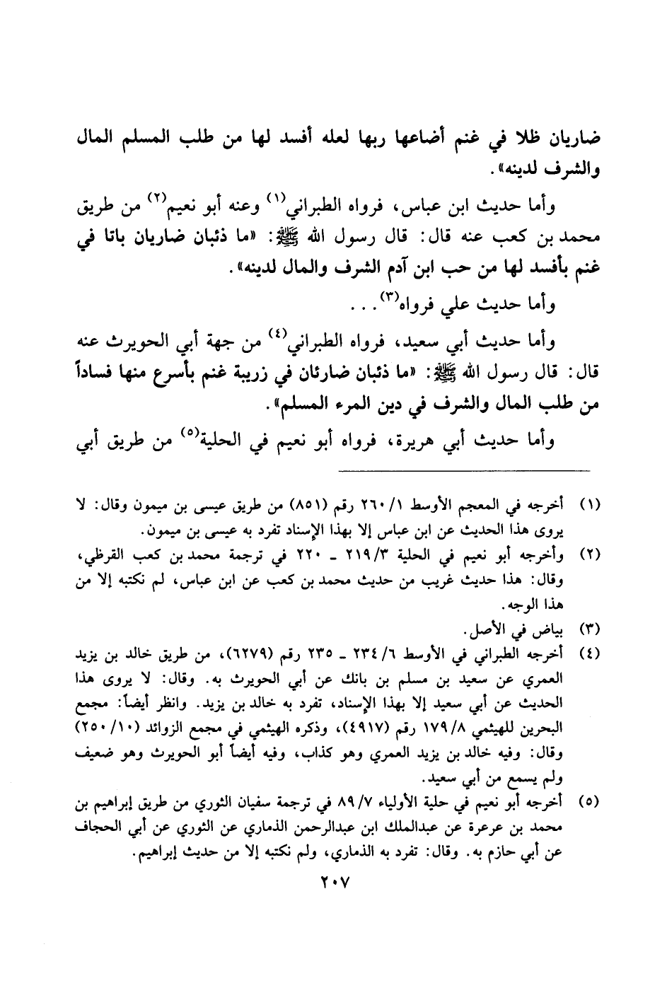 وأما حديث ابن عباس، فرواه الطبراني وعنه أبو نعيم من طريق محمد بن كعب عنه قال: قال رسول الله صلى الله عليه وسلم: "ما ذئبان ضاريان باتا في غنم بأفسد لها من حب ابن آدم الشرف والمال لدينه".