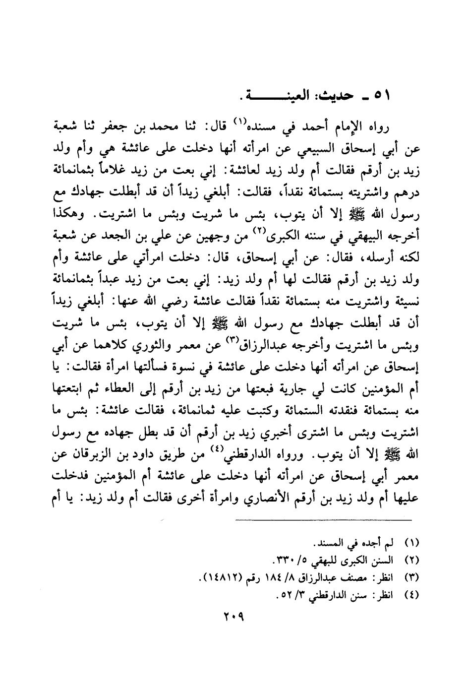 رواه الإمام أحمد في مسنده قال: ثنا محمد بن جعفر ثنا شعبة عن أبي إسحاق السبيعي عن امرأته أنها دخلت على عائشة هي وأم ولد زيد بن أرقم فقالت أم ولد زيد لعائشة: إني بعت من زيد غلامً بثمانمائة درهم واشتريته بستمائة نقدًا، فقالت: أبلغي زيدًا أن قد أبطلت جهادك مع رسول الله صلى الله عليه وسلم إلا أن يتوب، بئس ما شريت وبئس ما اشتريت. وهكذا أخرجه البيهقي في سننه الكبرى من وجهين عن علي بن الجعد عن شعبة لكنه أرسله، فقال: عن أبي إسحاق، قال: دخلت امرأتي على عائشة وأم ولد زيد بن أرقم فقالت لها أم ولد زيد: إني بعت من زيد عبدًا بثمانمائة نسيئة واشتريت منه بستمائة نقدًا فقالت عائشة رضي الله عنها: أبلغي زيدًا أن قد أبطلت جهادك مع رسول الله صلى الله عليه وسلم إلا أن يتوب، بئس ما شريت وبئس ما اشتريت وأخرجه عبد الرازق عن معمر والثوري كلاهما عن أبي إسحاق عن امرأته أنها دخلت على عائشة في نسوة فسألتها امرأة فقال: يا أم المؤمنين كانت لي جارية فبعتها من زيد بن أرقم إلى العطاء ثم ابتعتها منه بستمائة فنقدته الستمائة وكتبت عليه ثمانمائة، فقالت عائشة: بئس ما اشتريت وبئس ما اشترى أخبري زيد بن أرقم أن قد بطل جهاده مع رسول الله صلى الله عليه وسلم إلا أن يتوب. ورواه الدارقطني من طريق داود بن الزبرقان عن معمر أبي إسحاق عن امرأته أنها دخلت على عائشة أم المؤمنين فدخلت عليها أم ولد زيد بن أرقم الأنصاري وامرأة أخرى فقالت أم ولد زيد: يا أم