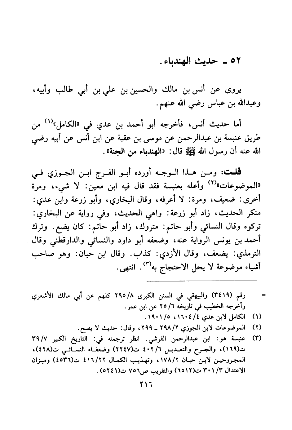 أما حديث أنس، فأخرجه أبو أحمد بن عدي في «الكامل» من طريق عنبسة بن عبد الرحمن عن موسى بن عقبة عن ابن أنس عن أبيه رضي الله عنه أن رسول الله صلى الله عليه وسلم قال: «الهندباء من الجنة».