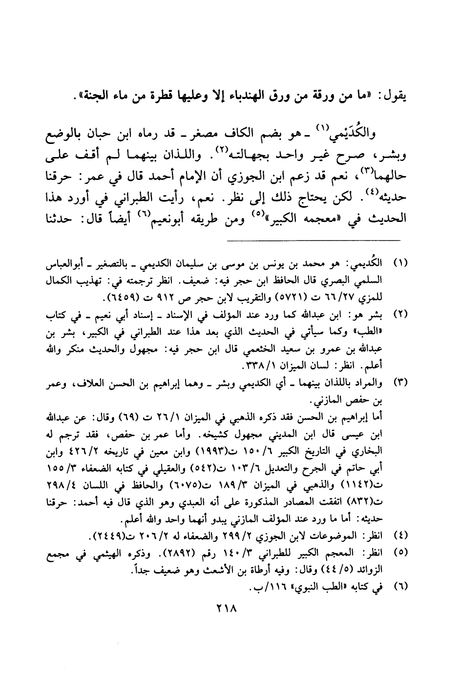 والكديمي ـ هو بضم الكاف مصغر ـ قد رماه ابن حبان بالوضع وبشر، صرح غير واحد بجهالته. واللذان بينهما لم أقف على حالهما، نعم قد زعم ابن الجوزي أن الإمام أحمد قال في عمر: حرقنا حديثه. لكن يحتاج ذلك إلى نظر. نعم، رأيت الطبراني في أورد هذا الحديث في "معجمه الكبير" ومن طريقه أبو نعيم أيضًا قال: حدثنا