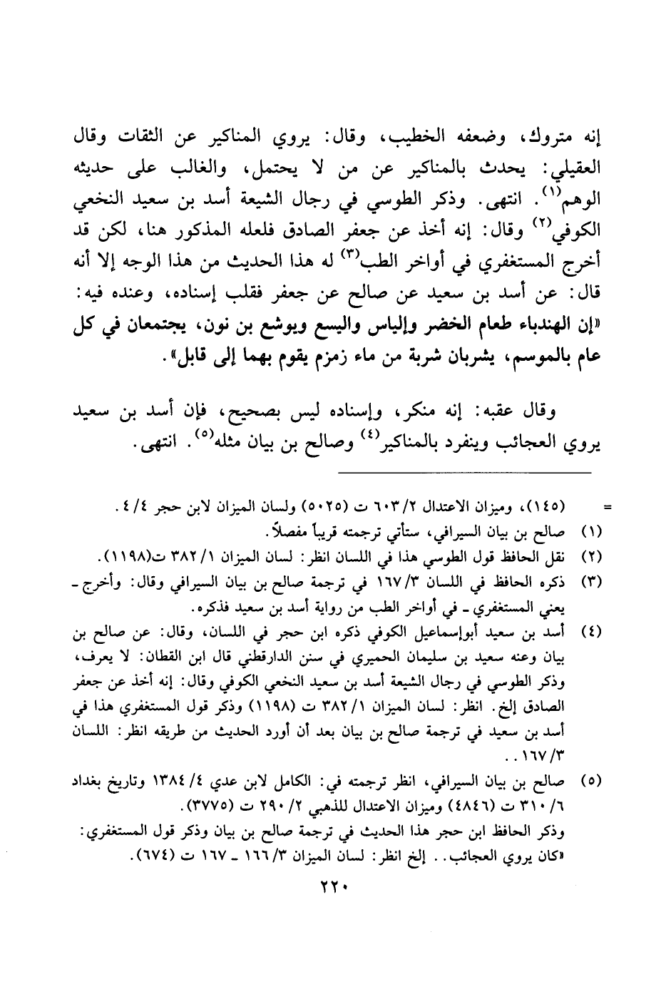 وقال عقبه: إنه منكر، وإسناده ليس بصحيح، فإن أسد بن سعيد يوري العجائب وينفرد بالمناكير وصالح بن بيان مثله. انتهى.