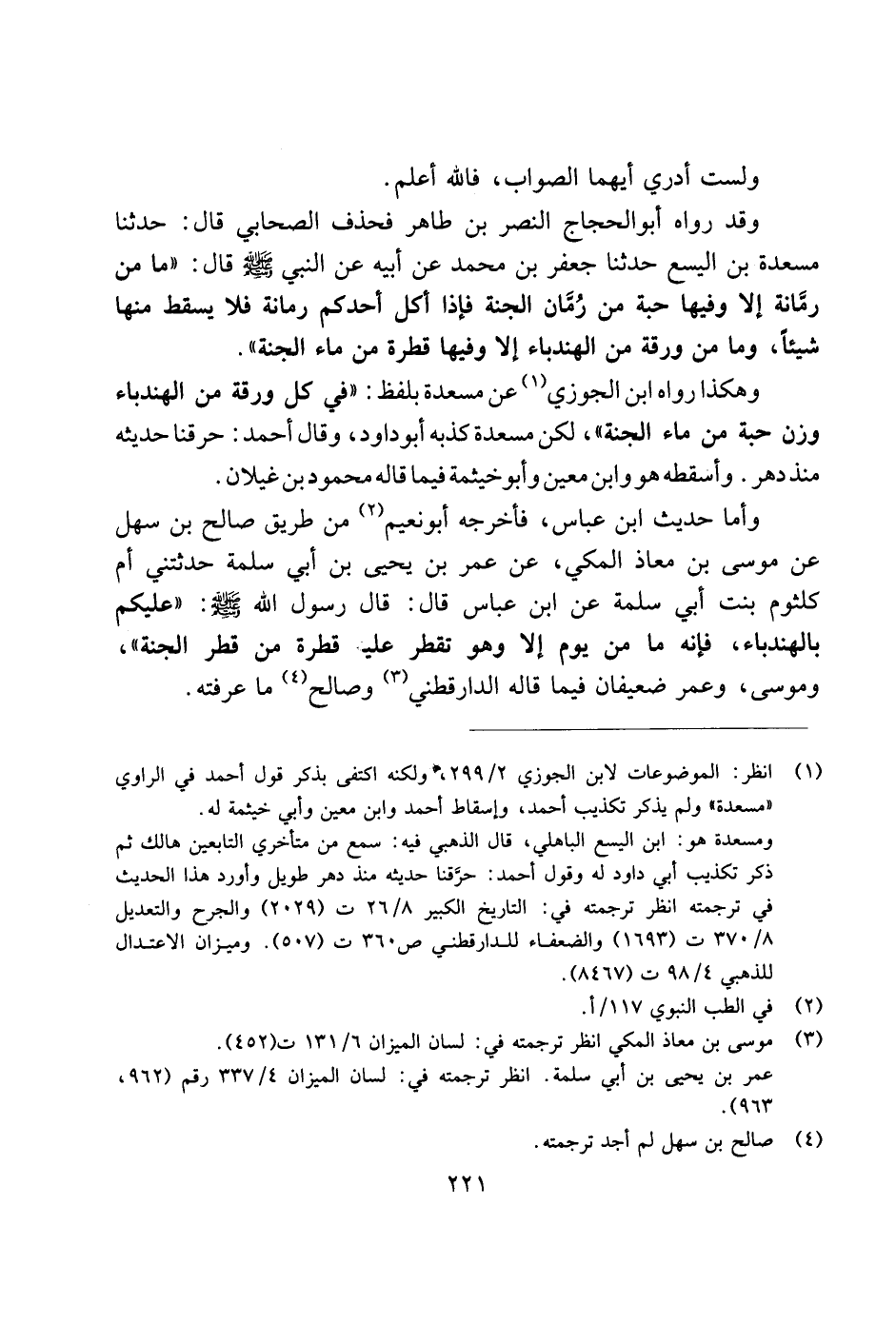 وهكذا رواه ابن الجوزي عن مسعدة بلفظ: "في كل ورقة من الهندباء وزن حبة من ماء الجنة"، لكن مسعدة كذبه أبو داود، وقال أحمد: حرقنا حديثه منذ دهر. وأسقه هو وابن معين وأبو خيثمة فيما قاله محمود بن غيلان.