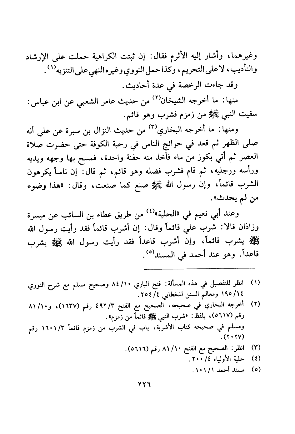 ومنها: ما أخرجه البخاري من حديث النزال بن سبرة عن علي أنه صلى الظهر ثم قعد في حوائج الناس في رحبة الكوفة حتى حضرت صلاة العصر ثم أتي بكوز من ماء فأخذ منه حفنة واحدة، فمسح بها وجهه ويديه ورأسه ورجليه، ثم قام فشرب فضله وهو قائم، ثم قال: إن ناسًا يكرهون الشرب قائمًا، وإن رسول الله صلى الله عليه وسلم صنع كما صنعت، وقال: "هذا وضوء من لم يحدث".