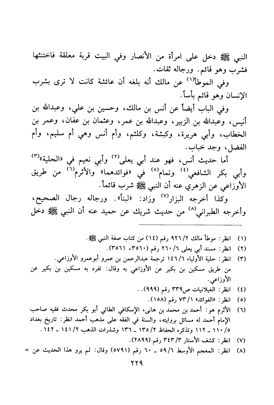 أما حديث أنس، فهو عند أبي يعلي وأبي نعيم في "الحلية" وأبي بكر الشافعي وتمام في "فوائدهما" والأثرم من طريق الأوزاعي عن الزهري عنه أن النبي صلى الله عليه وسلم شرب قائمًا.