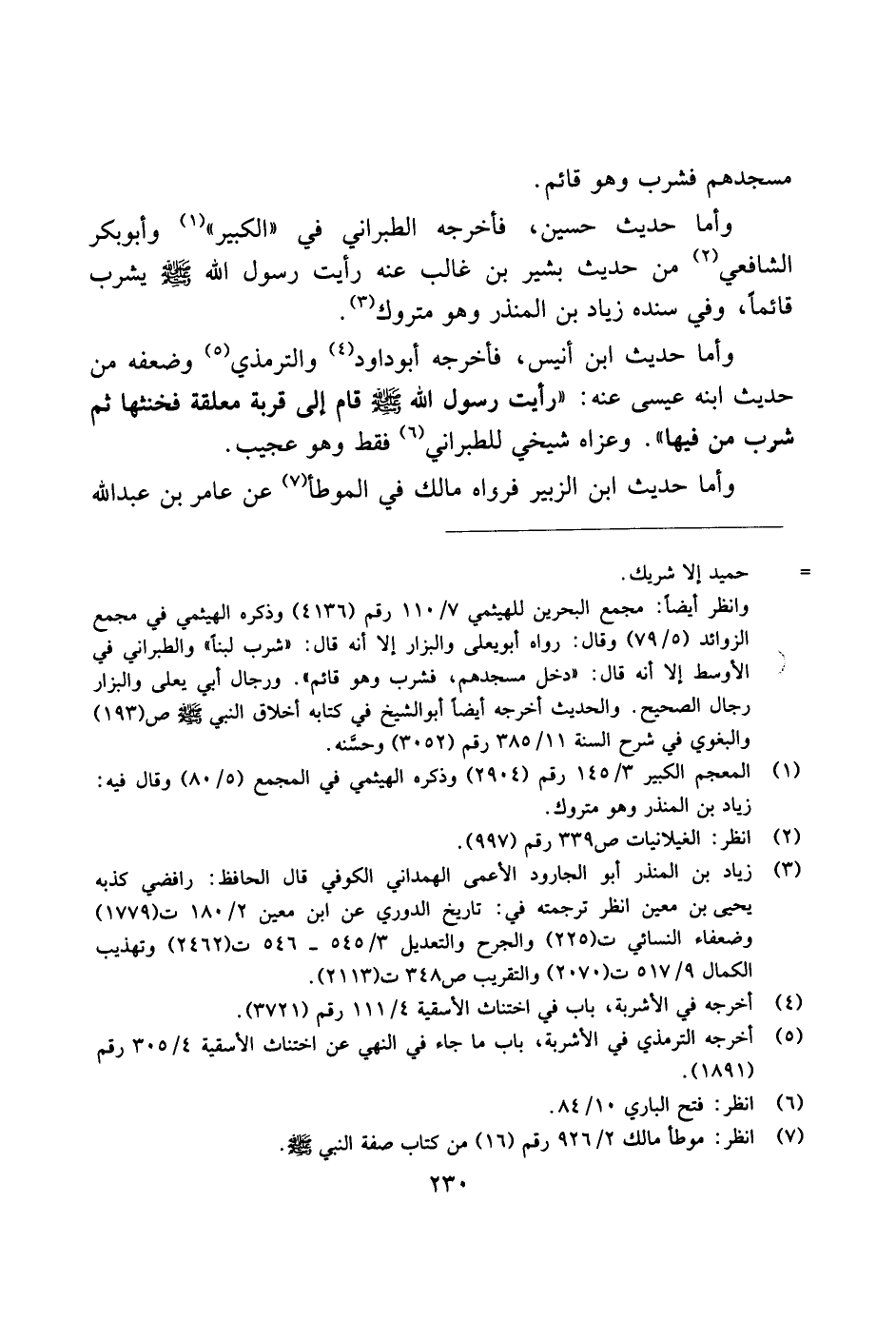 وأما حديث حسين، فأخرجه الطبراني في "الكبير" وأبو بكر الشافعي من حديث بشير بن غالب عنه رأيت رسول الله صلى الله عليه وسلم يشرب قائمًا، وفي سنده زياد بن المنذر وهو متروك.