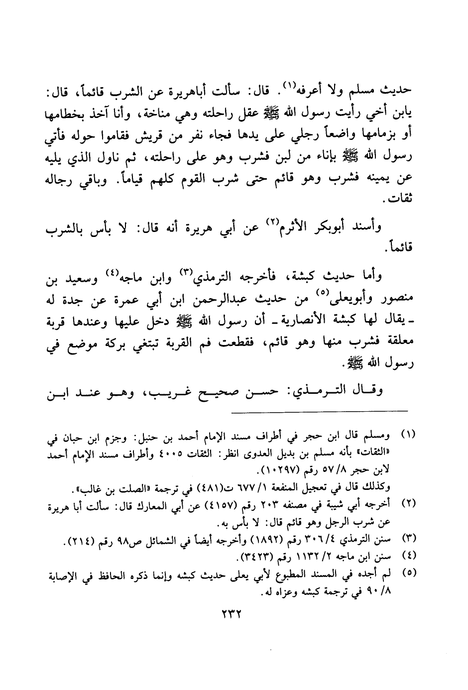 حديث مسلم ولا أعرفه. قال: سألت أبا هريرة عن الشرب قائمًا، قال: يا بن أخي رأيت رسول الله صلى الله عليه وسلم عقل راحلته وهي مناخة، وأنا آخذ بخطامها أو بزمامها واضعًا رجلي على يدها فجاء نفر من قريس فقاموا حوله فأتى رسول الله صلى الله عليه وسلم بإناء من لبن فشرب وهو على راحلته، ثم ناول الذي يليه عن يمينه فشرب وهو قائم حتى شرب القوم كلهم قيامًا. وباقي رجاله ثقات.