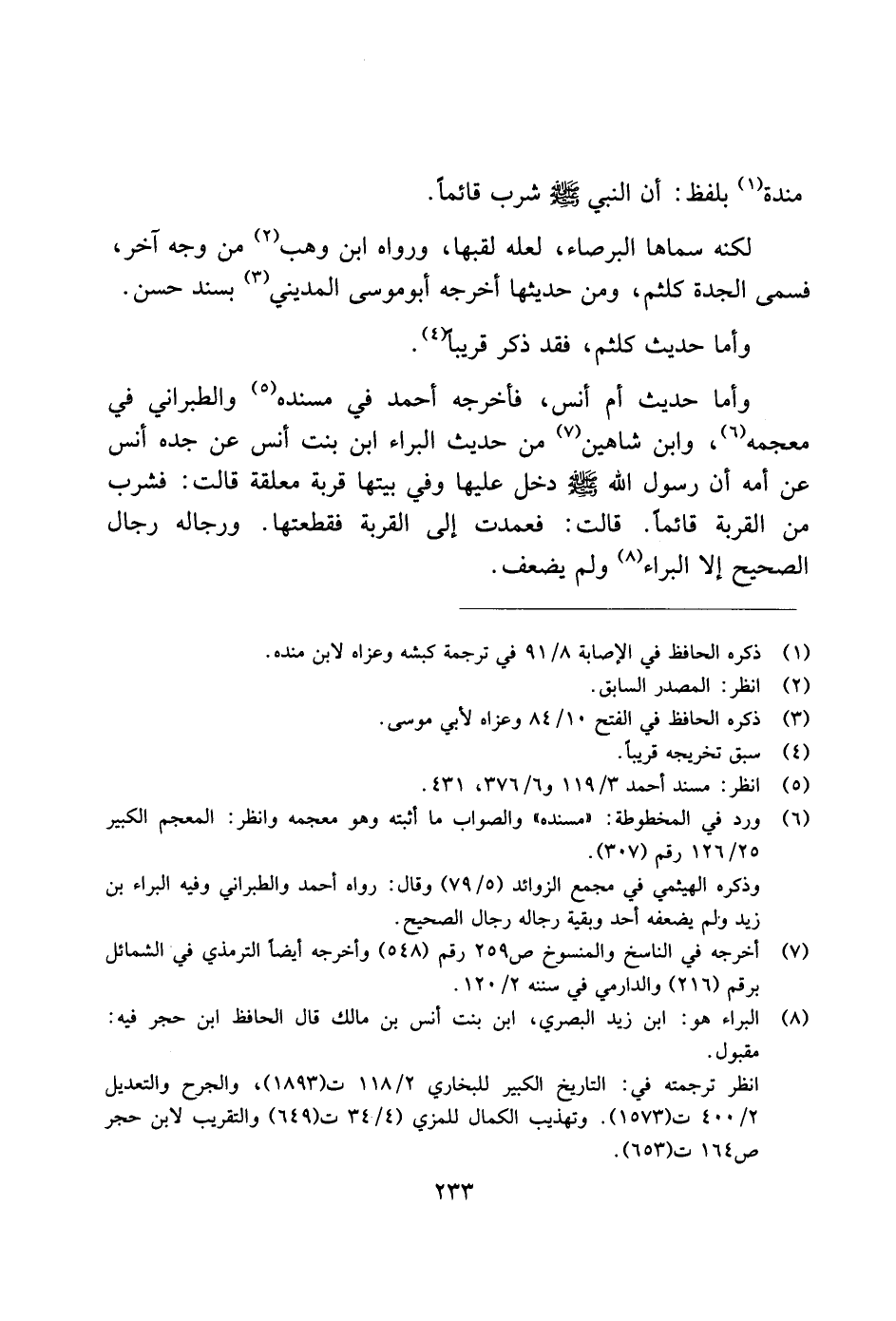وأما حديث أم أنس، فأخرجه أحمد في مسنده والطبراني في معجمه، وابن شاهين من حديث البراء ابن بنت أنس عن جده أنس عن أمه أن رسول الله صلى الله عليه وسلم دخل عليها وفي بيتها قربة معلقة قالت: فشرب من القربة قائمًا. قالت: فعدمت إلى القربة فقطعتها. ورجاله رجال الصحيح إلا البراء ولم يضعف.