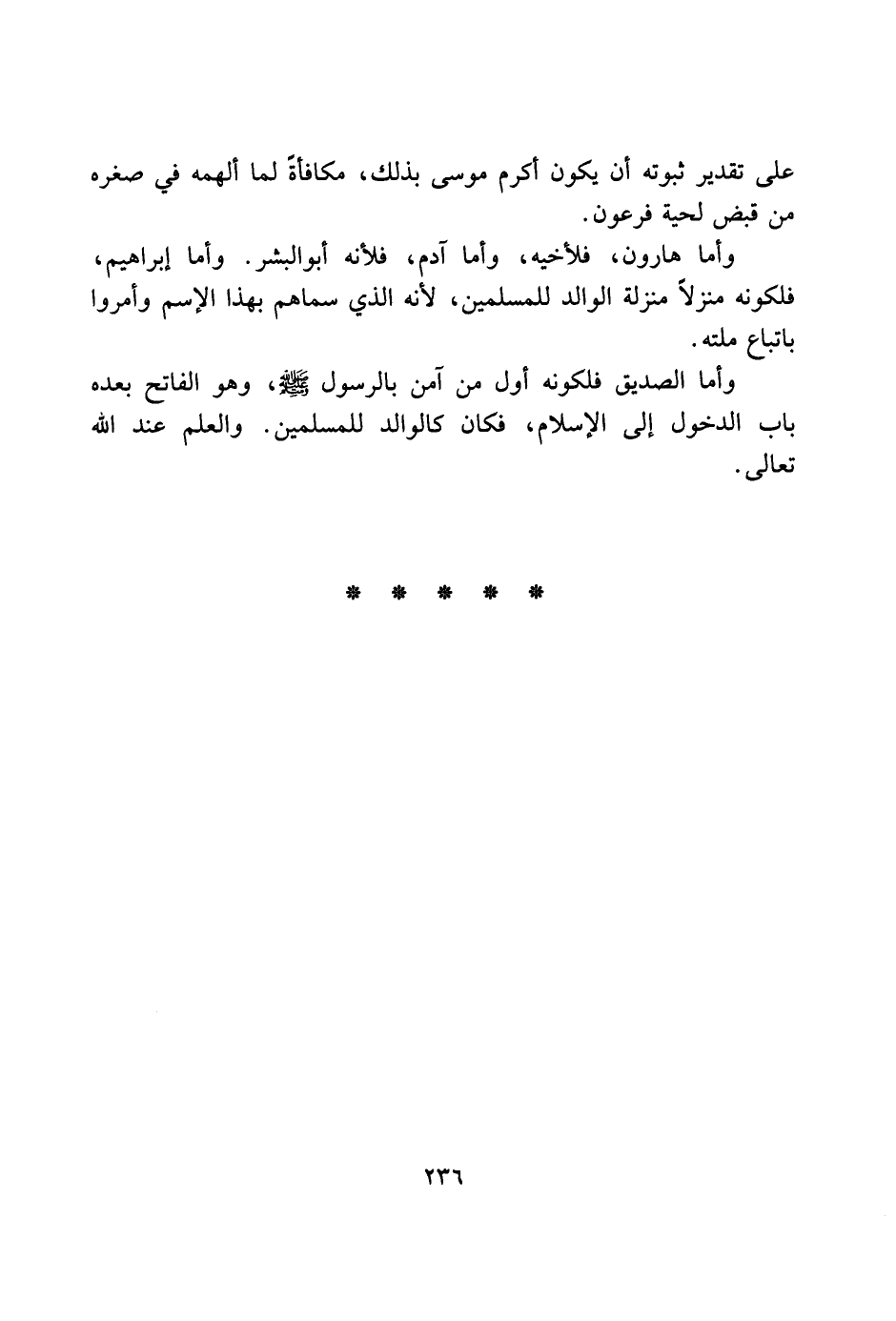 وأما هارون، فلأخيه، وأما آدم، فلأنه أبو البشر. وأما إبراهيم، فلكونه منزلاً منزلة الوالد للمسلمين، لأنه الذي سماهم بهذا الاسم وأمروا باتباع ملته.