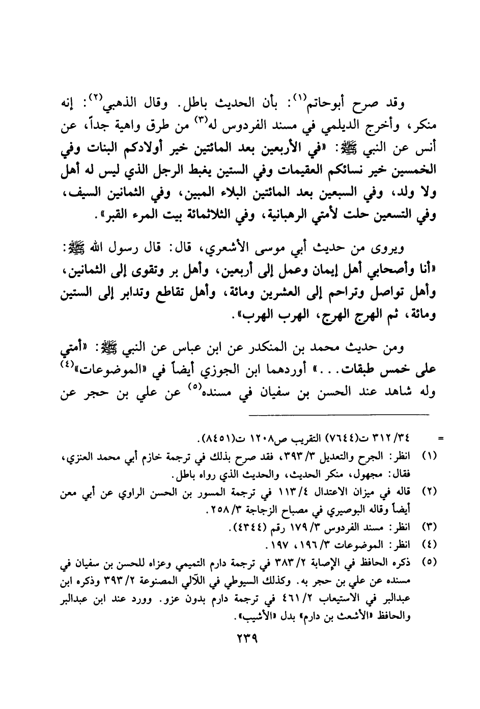 وقد صرح أبو حاتم: بأن الحديث باطل. وقال الذهبي: إنه منكر، وأخرج الديلمي في مسند الفردوس له من طرق واهية جدًا، عن أنس عن النبي صلى الله عليه وسلم: "في الأربعين بعد المائتين خير أولادكم البنات وفي الخمسين خير نسائكم العقيمات وفي الستين يغبط الرجل الذي ليس له أهل ولا ولد، وفي السبعين بعد المائتين البلاء المبين، وفي الثمانين السيف، وفي التسعين حلت لأمتي الرهبانية، وفي الثلاثمائة بيت المرء القبر".