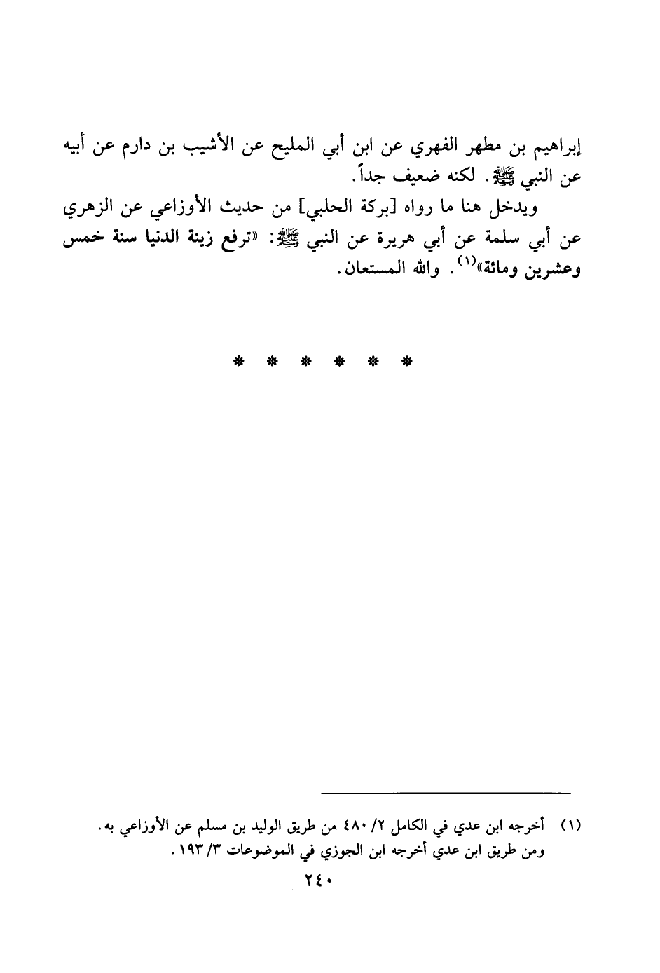ويدخل هنا ما رواه [بركة الحلبي] من حديث الأوزاعي عن الزهري عن أبي سلمة عن أبي هريرة عن النبي صلى الله عليه وسلم: "ترفع زينة الدنيا سنة خمس وعشرين ومائة". والله المستعان.
