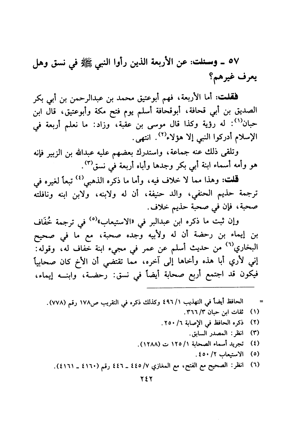 57 - وسئلت: عن الأربعة الذين رأوا النبي صلى الله عليه وسلم في نسق وهل يعرف غيرهم؟