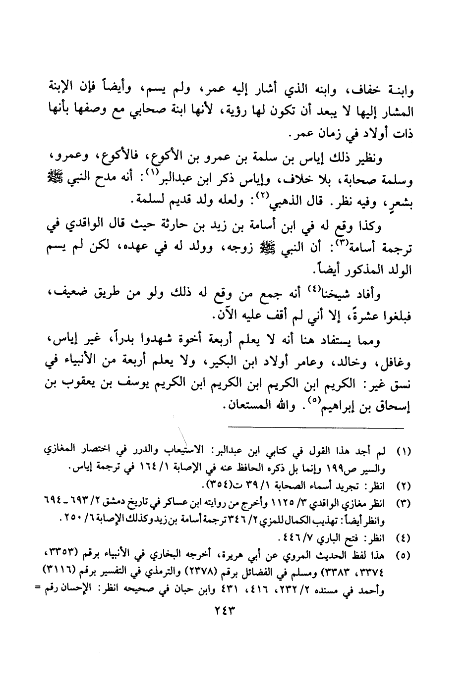 ومما يستفاد هنا أنه لا يعلم أربعة أخوة شهدوا بدرًا، غير إياس، وغافل، وخالد، وعامر أولاد ابن البكير، ولا يعلم أربعة من الأنبياء في نسق غير: الكريم ابن الكريم ابن الكريم ابن الكريم يوسف بن يعقوب بن إسحاق بن إبراهيم. والله المستعان.