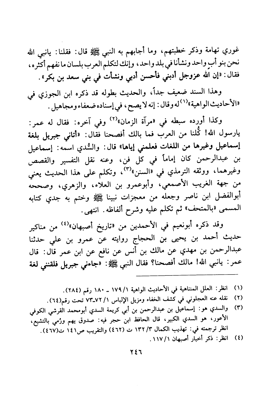 وكذا أورده سبطه في "مرآة الزمان" وفي آخره: فقال له عمر: يا رسول الله! كُلنا من العرب فما بالك أفصحنا فقال: "أتاني جبريل بلغة إسماعيل وغيرها من اللغات فعلمني إياها" قال: والسُّدي اسمه: إسماعيل بن عبد الرحمن كان إمامًا في كل فن، وعنه نقل التفسير والقصص وغيرهما، ووثقه الترمذي في "السنن"، وتكلم على هذا الحديث يعني من جهة الغريب الأصمعي، وأبو عمرو بن العلاء، والزهري، وصححه أبو الفضل ابن ناصر وجعله من معجزات نبينا صلى الله عليه وسلم وختم به جدي كتابه المسمى "بالمتحف" ثم تكلم عليه وشرح ألفاظه. انتهى.