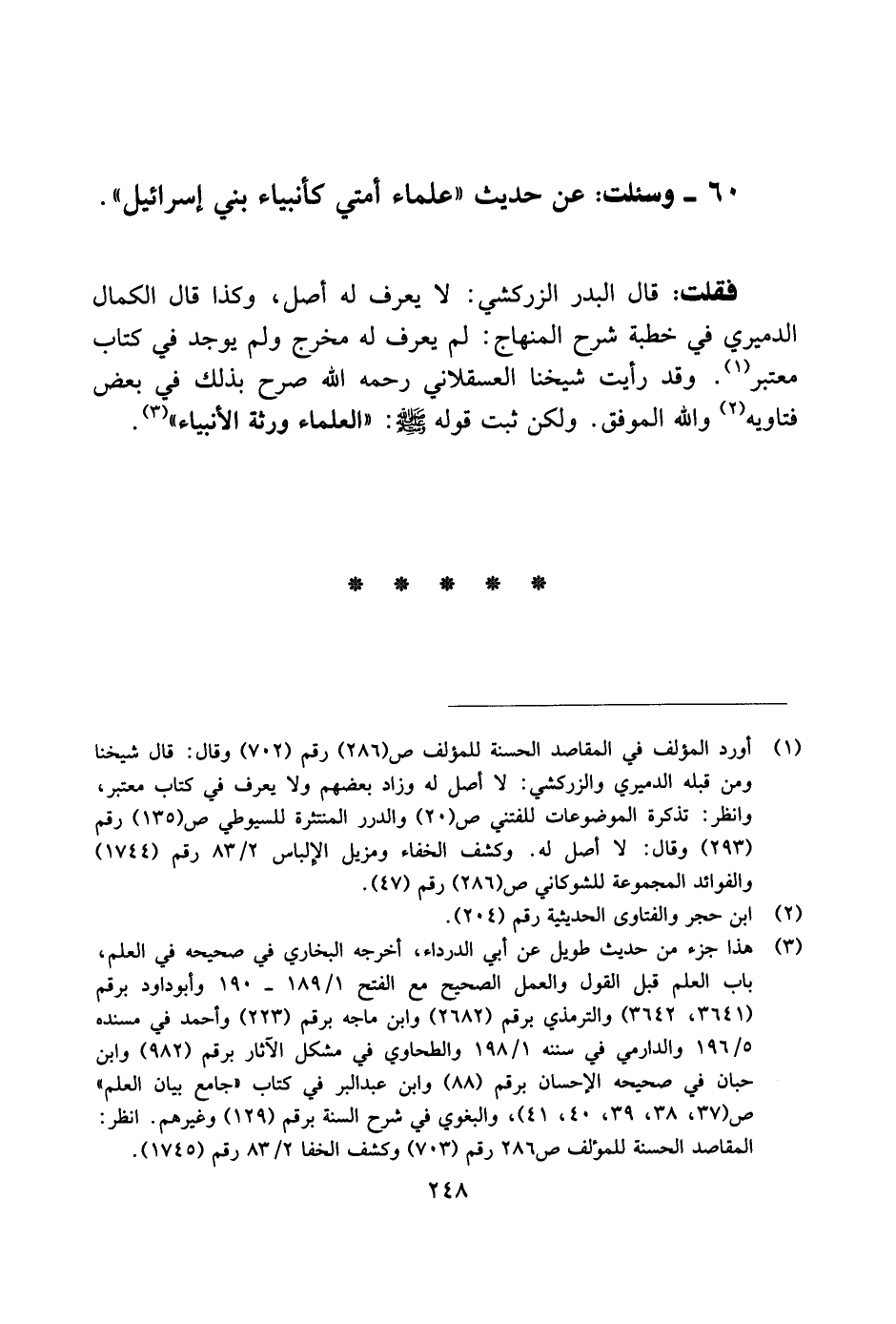 60 - وسئلت: عن حديث "علماء أمتي كأنبياء بني إسرائيل".