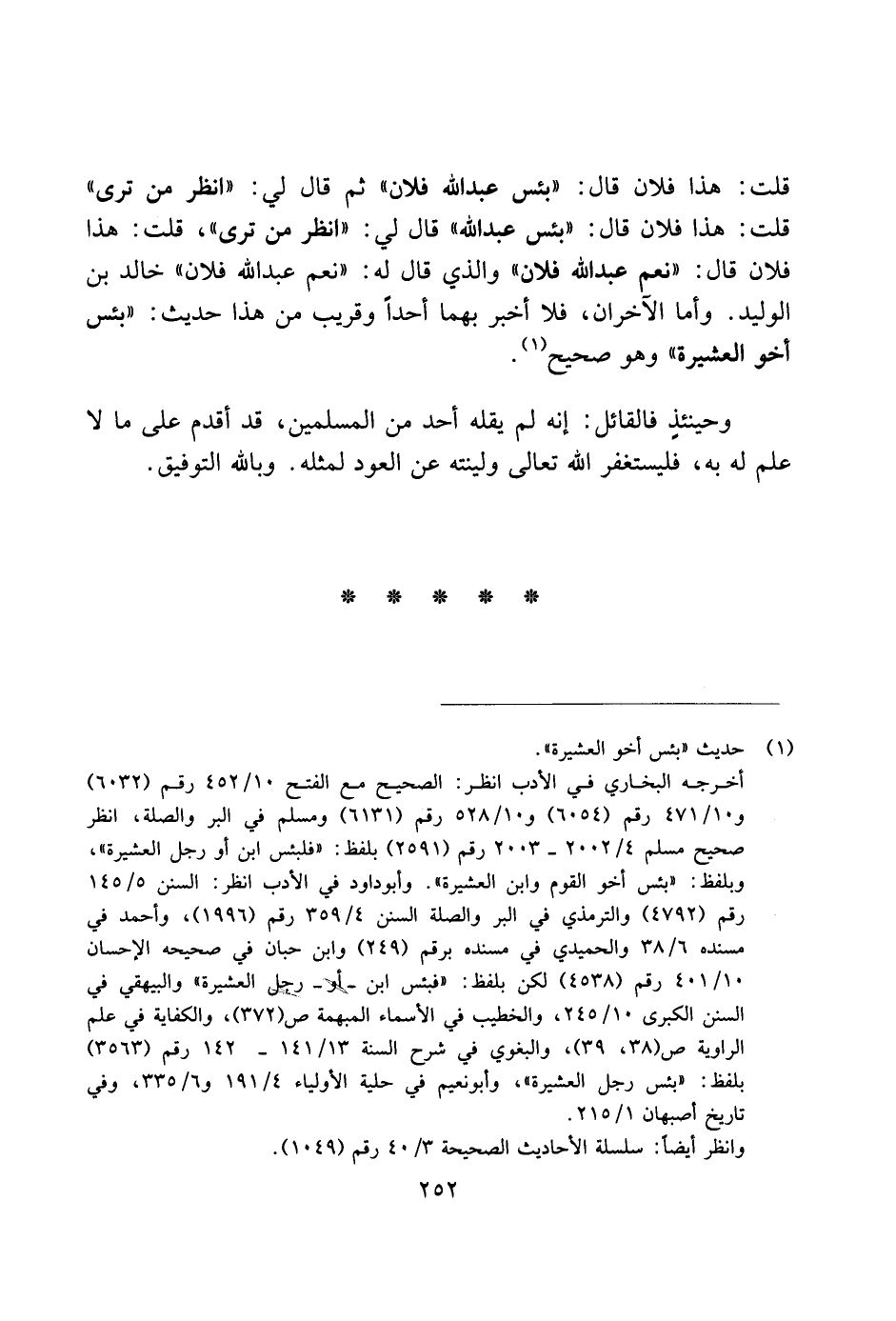 قلت: هذا فلان قال: "بئس عبد الله فلان" ثم قال لي: "انظر من ترى" قلت: هذا فلان قال: "بئس عبد الله" قال لي: "انظر من ترى"، قلت: هذا فلان قال: "نعم عبد الله فلان" والذي قال له: "نعم عبد الله فلان" خالد بن الوليد. وأما الآخران، فلا أخبر بهما أحدًا وقريب من هذا حديث: "بئس أخو العشيرة" وهو صحيح.