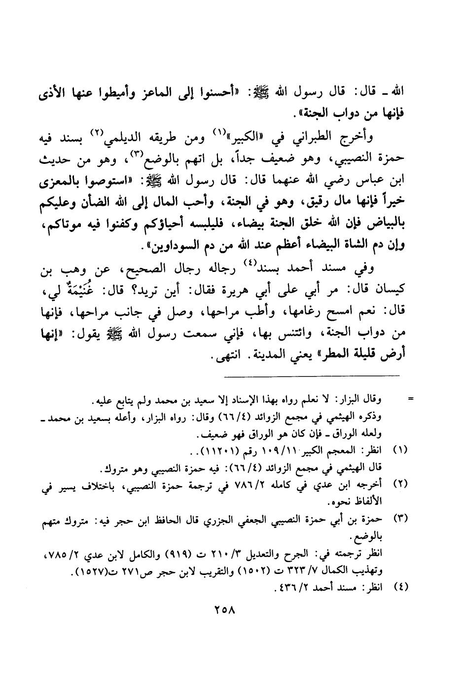 وأخرج الطبراني في "الكبير" ومن طريقه الديلمي بسند فيه حمزة النصيبي، وهو ضعيف جدًا، بل اتهم بالوضع، وهو من حديث ابن عباس رضي الله عنهما قال: قال رسول الله صلى الله عليه وسلم: "استوصوا بالمعزى خيرًا فإنها مال رقيق، وهو في الجنة، وأحب المال إلى الله الضأن وعليكم بالبياض فإن الله خلق الجنة بيضاء، فليلبسه أحياؤكم وكفنوا فيه موتاكم، وإن دم الشاة البيضاء أعظم عند الله من دم السوداوين".