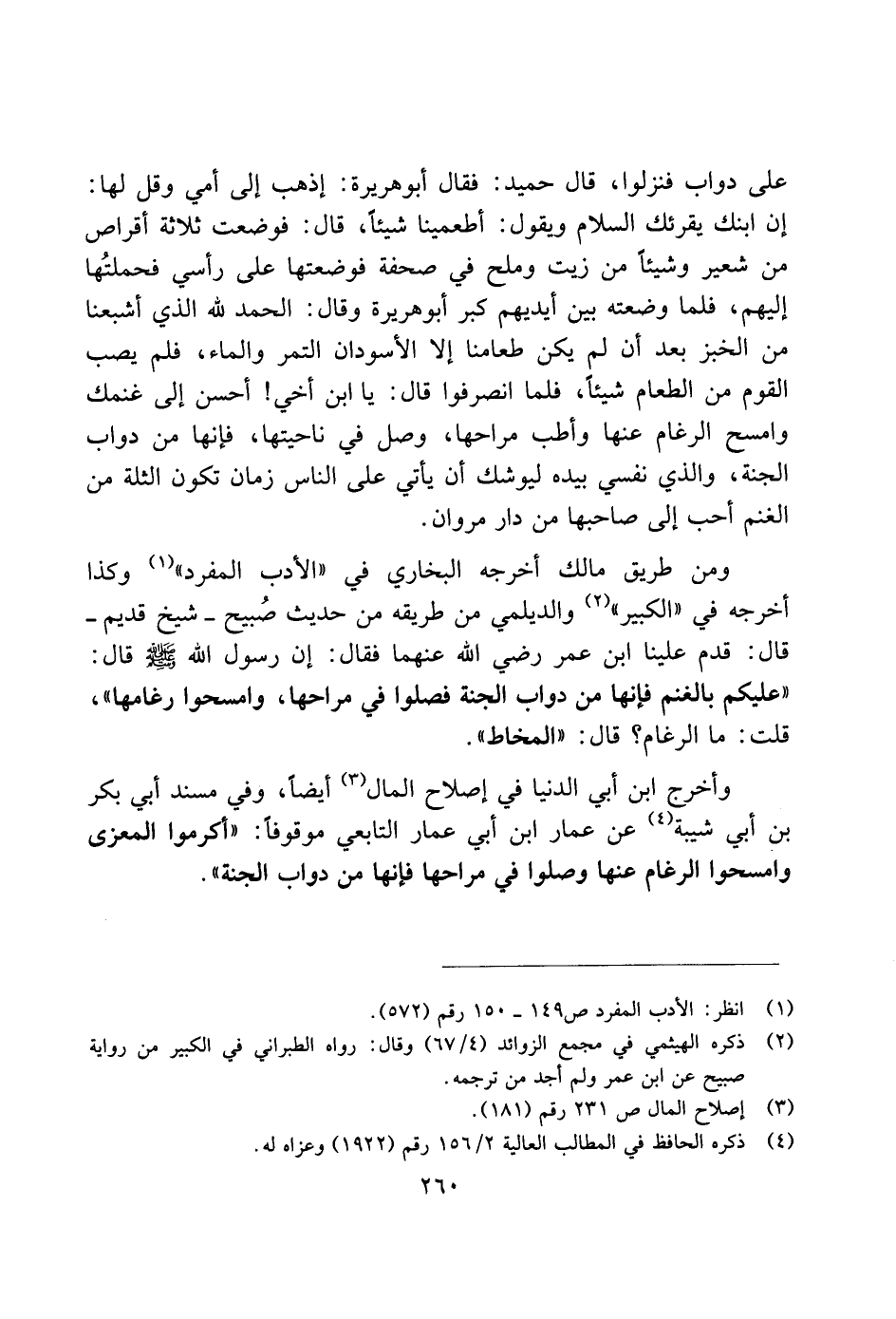 على دواب فنزلوا، قال حميد: فقال أبو هريرة: إذهب إلى أمي وقل لها: إن ابنك يقرئك السلام ويقول: أطعمينا شيئًا، وقال: فوضعت ثلاثة أقراص من شعير وشيئًا من زيت وملح في صفحة فوضعتها على رأسي فحملتُها إليهم، فلما وضعته بين ايديهم كبر أبو هريرة وقال: الحمد لله الذي أشبعنا من الخبز بعد أن لم يكن طعامنا إلا الأسودان التمر والماء، فلم يصب القوم من الطعام شيئًا، فلما انصرفوا قال: يا ابن أخي! أحسن إلى غنمك وامسح الرغام عنها وأطب مراحلها، وصل في ناحيتها، فإنها من دواب الجنة، والذي نفسي بيده ليوشك أن يأتي على الناس زمان تكون الثلة من الغنم أحب إلى صاحبها من دار مروان.