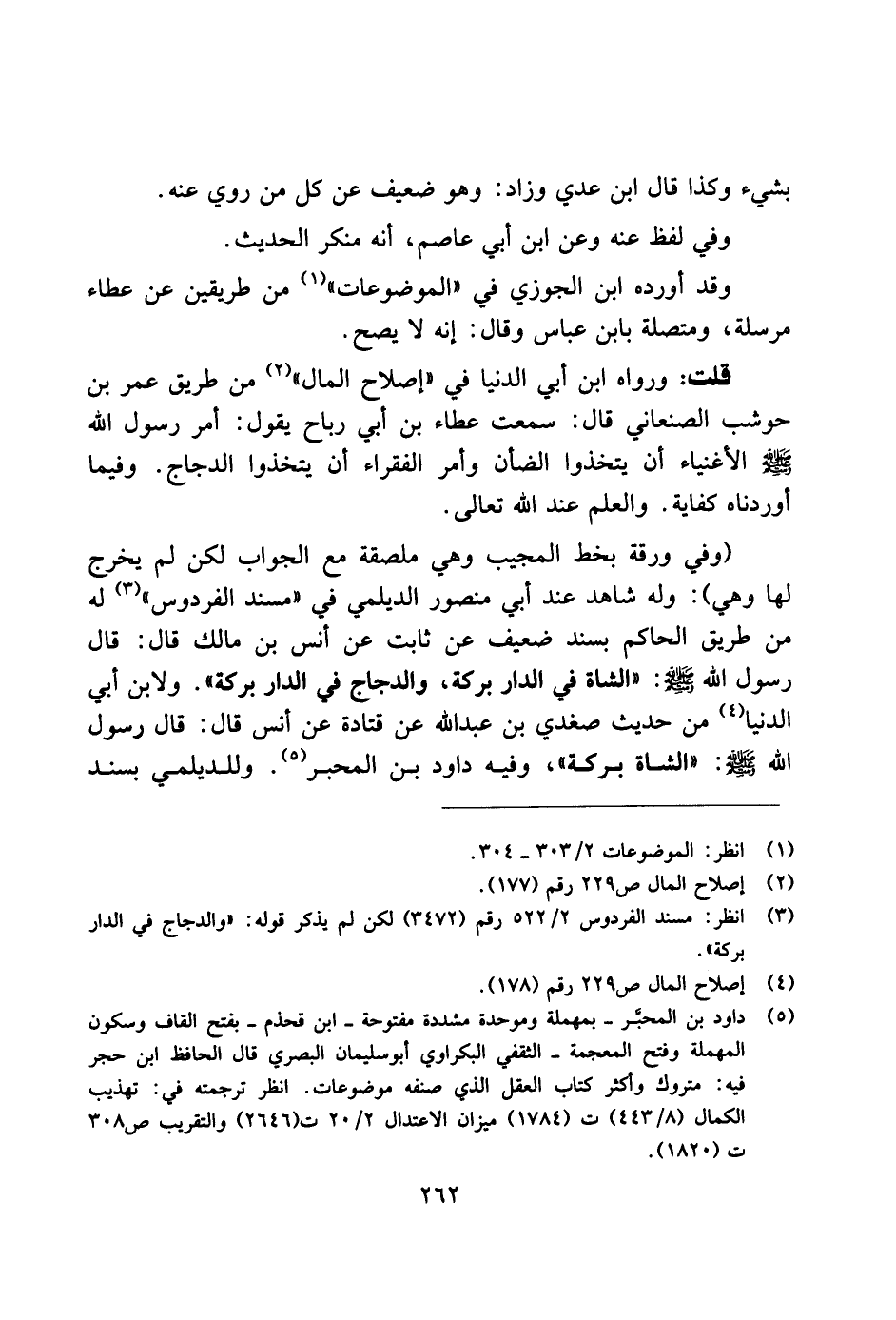 (وفي ورقة بخط المجيب وهي ملصقة مع الجواب لكن لم يخرج لها وهي): وله شاهد عند أبي منصور الديلمي في «مسند الفردوس» له من طريق الحاكم بسند ضعيف عن ثابت عن أنس بن مالك قال: قال رسول الله صلى الله عليه وسلم: «الشاة في الدار بركة، والدجاج في الدار بركة». ولابن أبي الدنيا من حديث صغدي بن عبد الله عن قتادة عن أنس قال: قال رسول الله صلى الله عليه وسلم: «الشاة بركة»، وفيه داود بن المحبر. وللديلمي بسند
